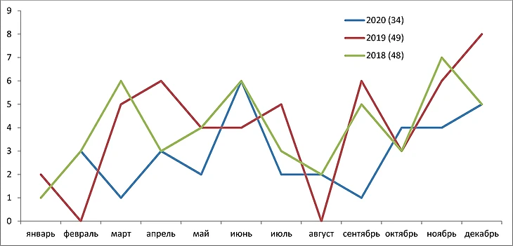 На втором графике представлено количество турниров ежемесячно. В 2018 и 2019 было проведено практически равное количество турниров (48 и 49 соответственно), а вот 2020 по понятным причинам провалился до 34 турниров.