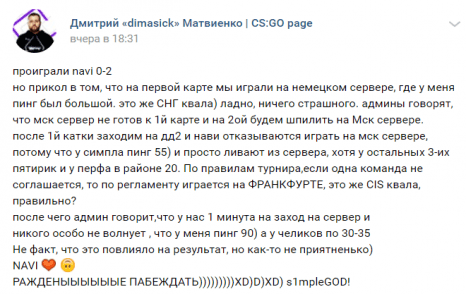 «Мы решили сдаться на последней карте квалификации, потому что нас заставляли играть с пингом 200. ESL решила, что пинг 195 – это нормально в решающем матче.»