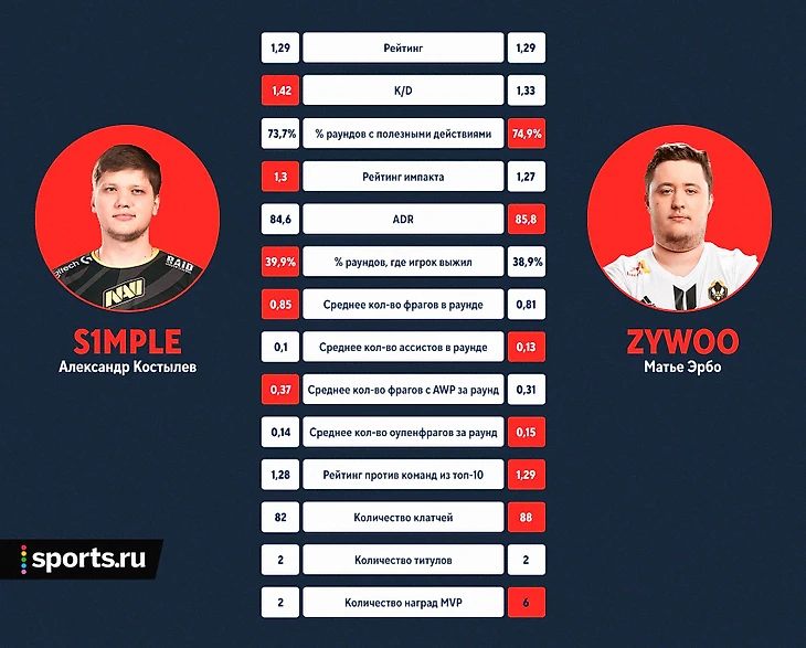 Мы собрали всю основную статистику двух игроков за 2020 год в одну картинку, на которой наглядно видно, в чем был лучше каждый из них. Равенство Симпла и Зайву в некоторых показателях только доказывает, что в 2020-м эти парни шли ноздря в ноздрю на протяжении всего сезона.