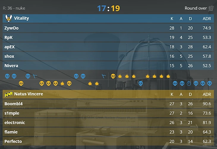Вторая половина на Nuke началась для NAVI крайне неудачно. Vitality успешно напрягала контр-террористов по всей карте и брала раунд за раундом без особых проблем. При счете 9:13 Natus Vincere могли прервать серию поражений, но проиграли крайне обидный раунд 3 в 5.