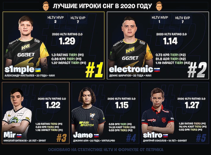 Было бы странно, если бы пятый лучший игрок планеты в 2020 году оказался ниже второй строчки в рейтинге лучших игроков СНГ. Безусловно, звездная парочка NAVI впереди всех остальных игроков региона банально из-за того, что свою феноменальную стабильность и форму демонстрирует против сильнейших коллективов мира и постоянно борется за звание топ-1 команды планеты. Electronic за сезон получил 7 званий EVP от HLTV и в начале 2020-го впервые в карьере был награжден званием MVP турнира. Удивителен лишь тот факт, что на турнирах внутри региона electronic не блистал: RMR-ивенты в 2020 ему давались нелегко, а потому он не вошел в топ-10 ни в одной tier2 номинации.