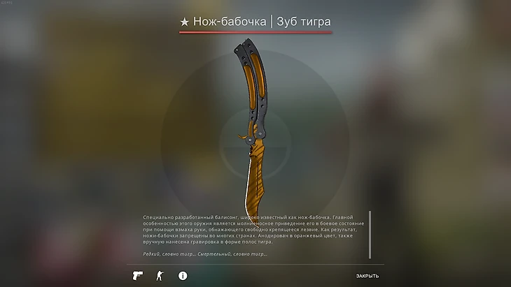 С отрывом самый дорогой предмет в инвентаре футболиста – нож-бабочка. Это основной нож Зинченко, с которым он играет в большинстве матчей. Интересно, что скин «Зуб тигра» стоит дороже в качестве «Немного поношенное», чем в самом лучшем – «Прямо с завода». Причина – в редком проценте выпадения более поношенного скина.