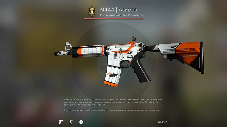 Скины для M4A4 или, как ее часто называют, «толстая эмка», уже стоят значительно дороже. Однако тут дело не только в популярности самого оружия, но и в редкости этой конкретной раскраски. Скин «Азимов» вышел еще в 2013 году, после чего постепенно становился все дороже и дороже. Скорее всего, именно с этой пушкой Зинченко играет чаще всего.
