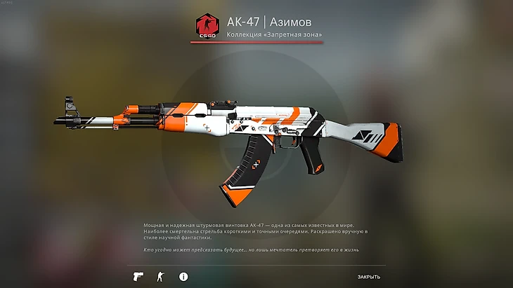 Такой же скин, но другое оружие. Раскраска «Азимов» для AK-47 вышла гораздо позже, чем для M4A4, так что и ее стоимость значительно ниже. Ранее Зинченко использовал AK-47 со скином «Снежный вихрь», однако в последнее время переключился на новый облик для оружия.