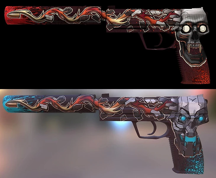Один из самых эффектных скинов для USP-S «Подтвержденное убийство» в Китае также выглядит иначе. В Perfect World на нем вместо черепа изображена металлическая маска, чем-то напоминающая экипировку Корво Аттано из Dishonored.