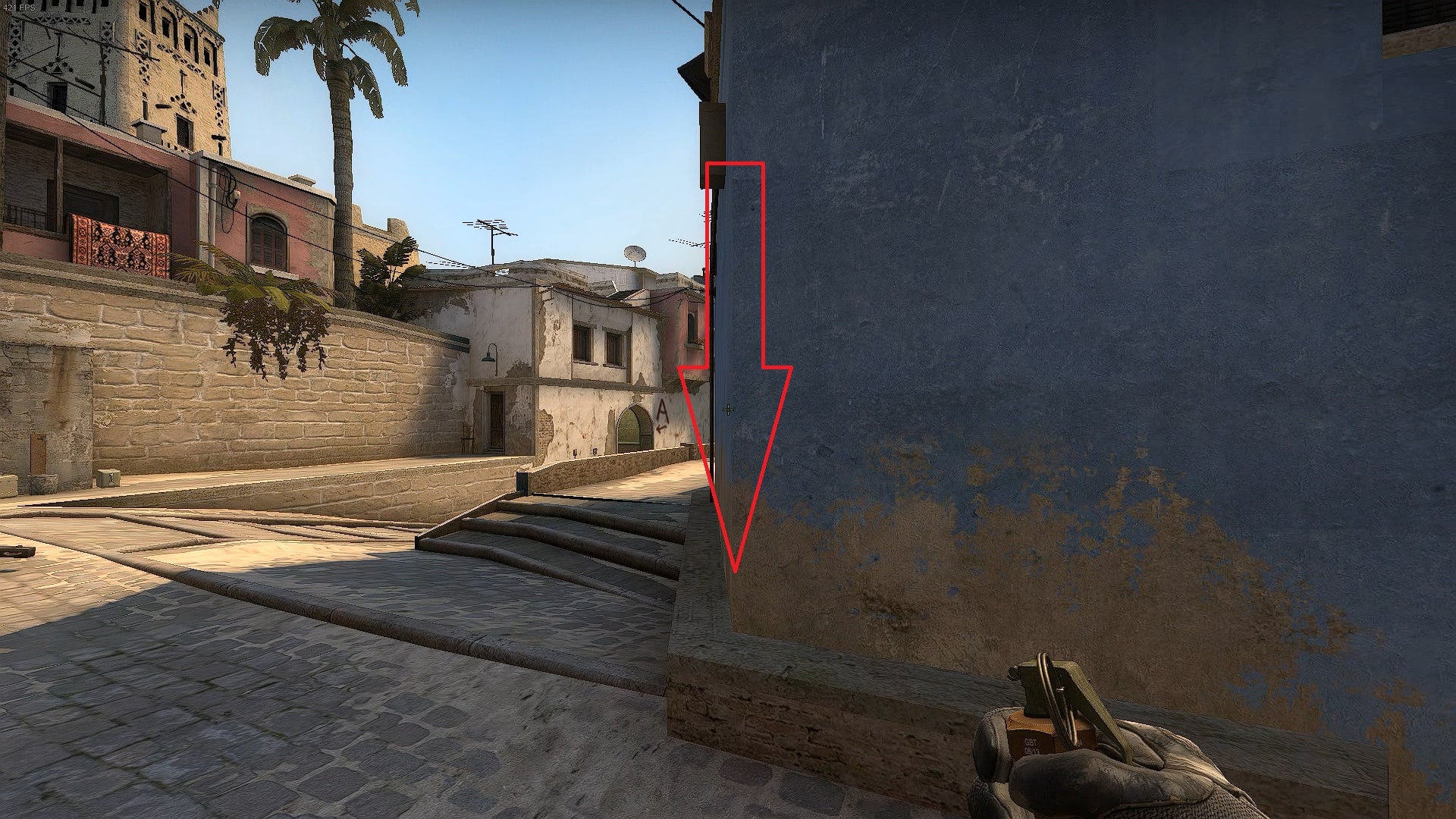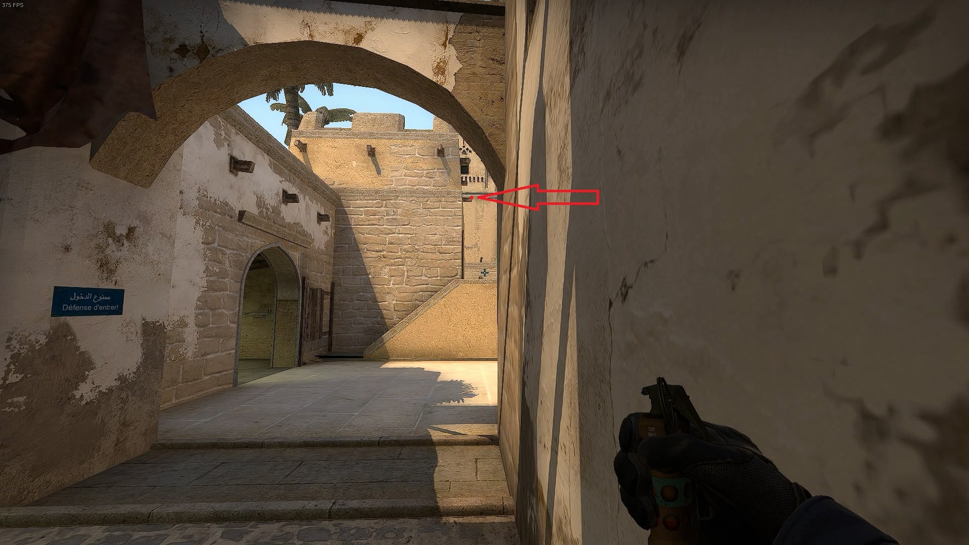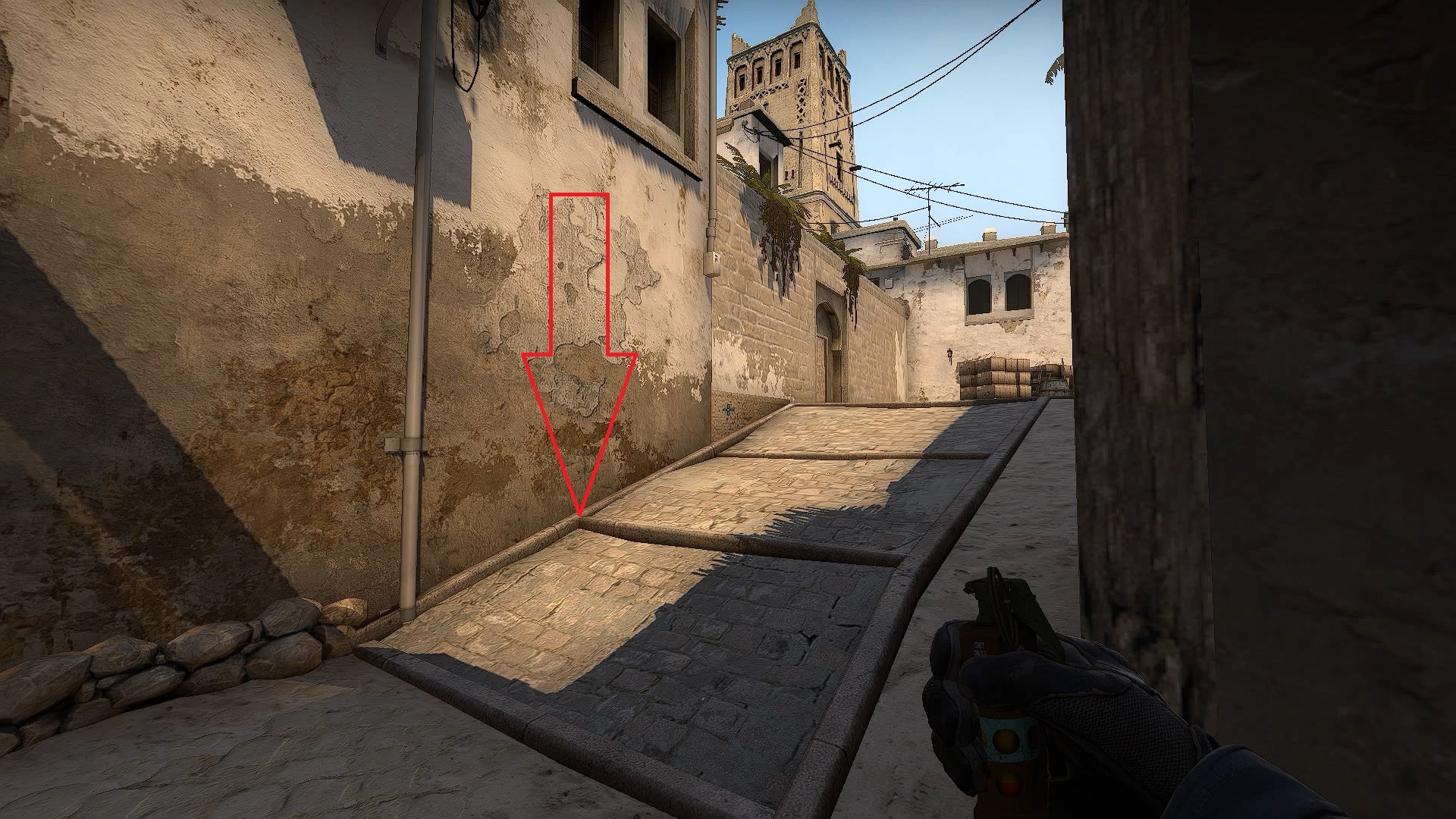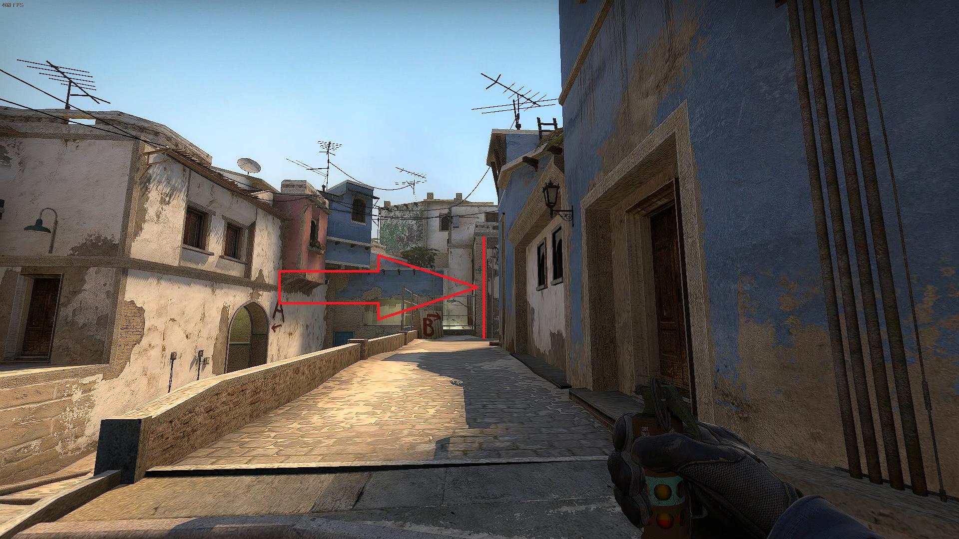 Видите небольшой выступ в стене, который образует угол? Наводим прицел в его верхнюю часть и уводим перекрестие чуть левее. После этого делаем несколько шагов и бросаем флэшку на бегу. Таким образом вы ослепите соперников на всех основных позициях точки В.
