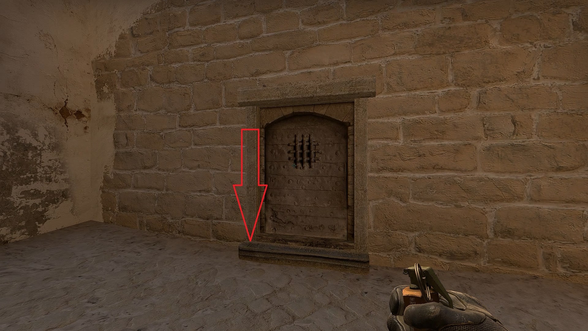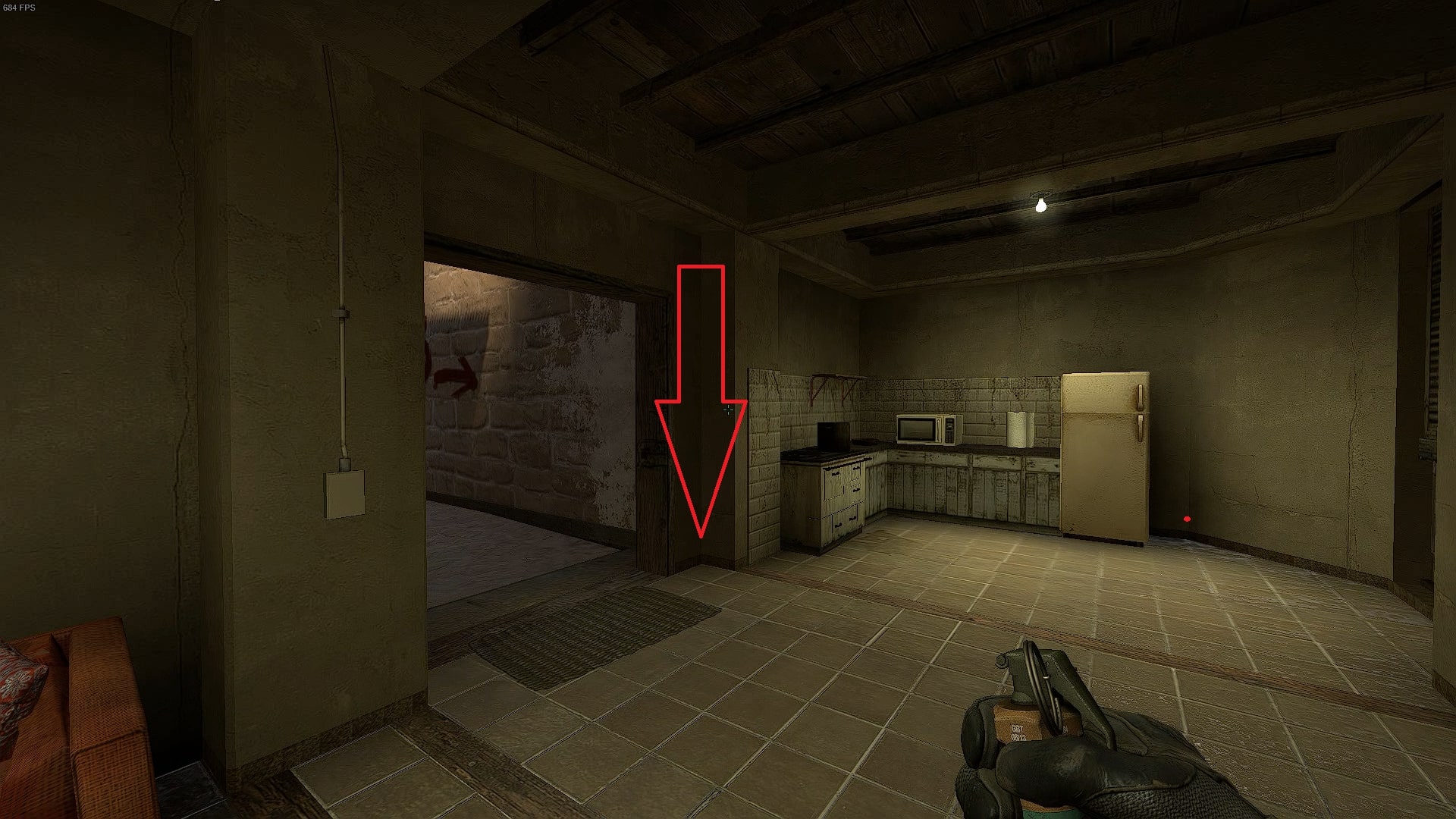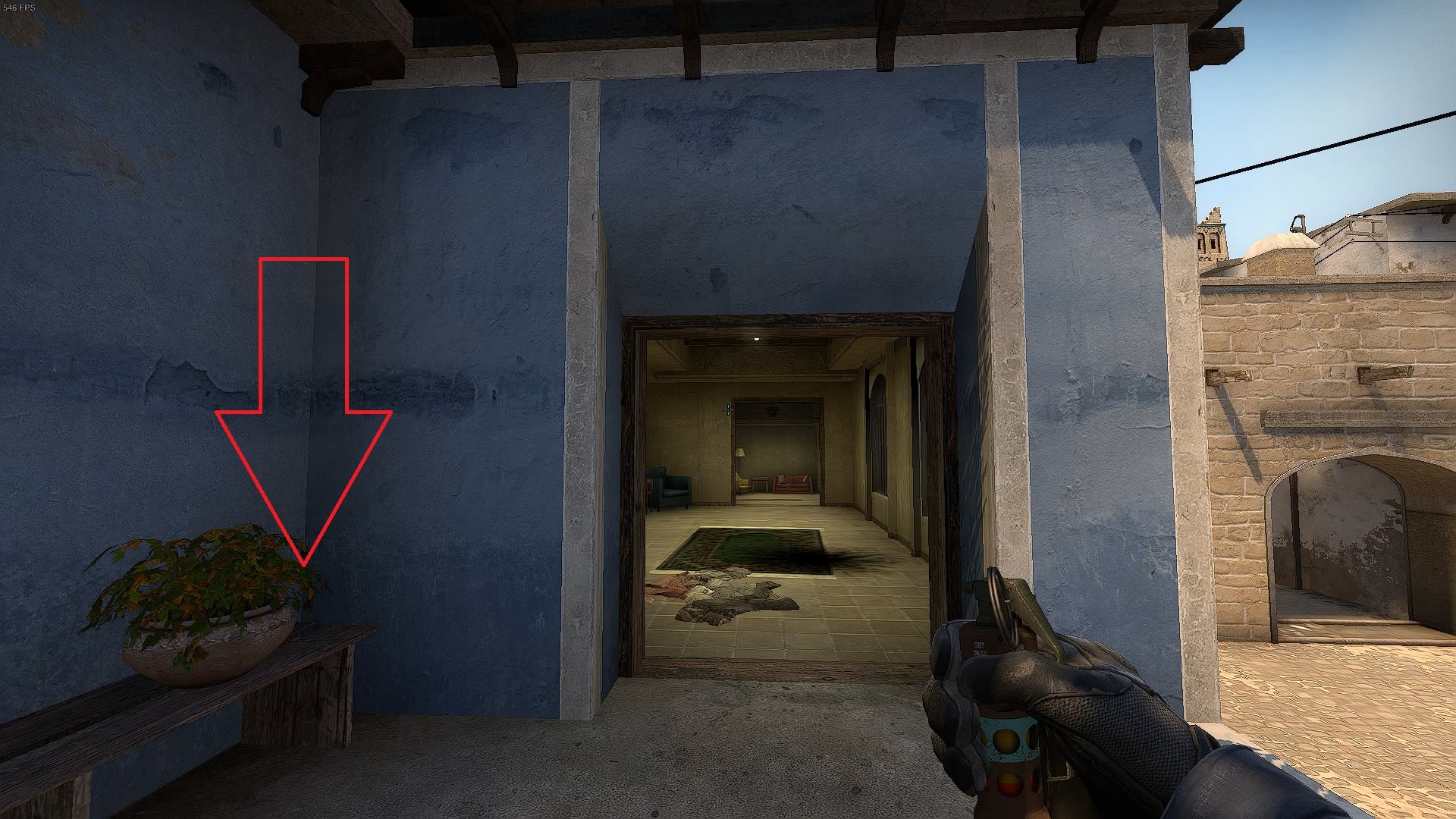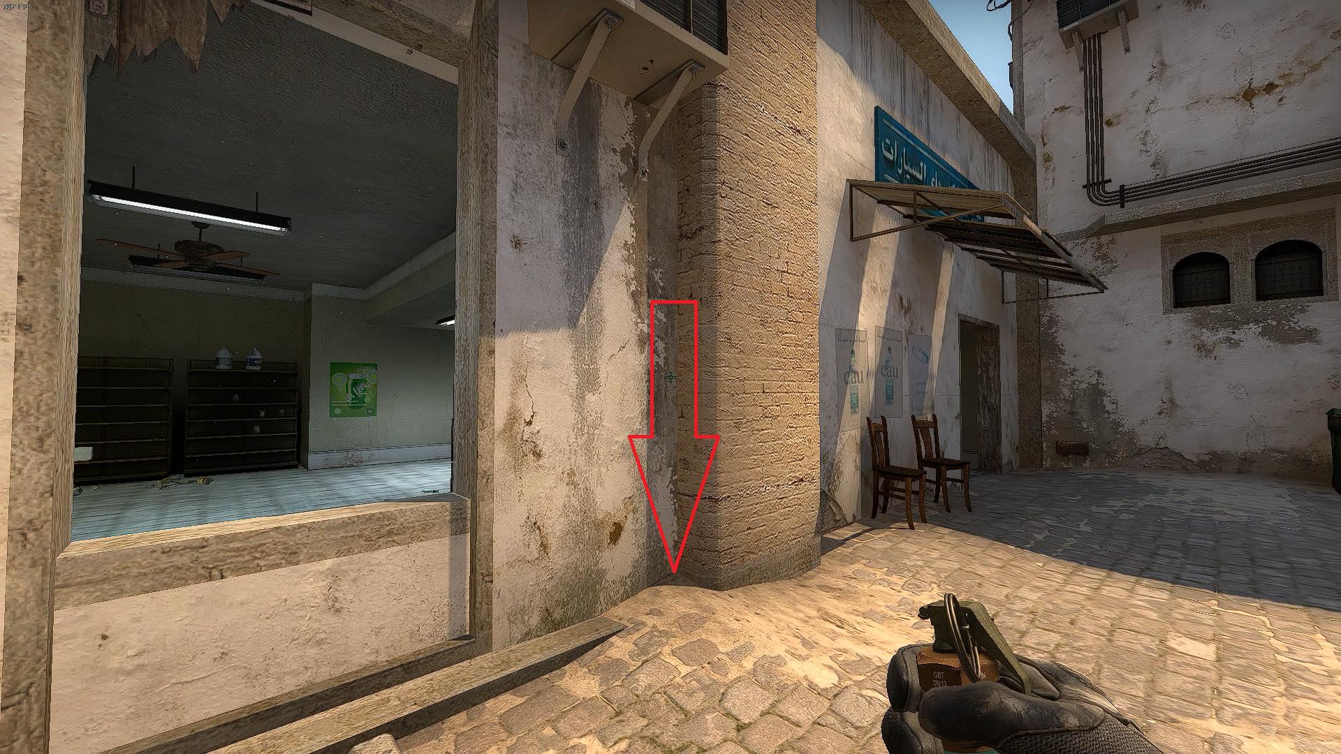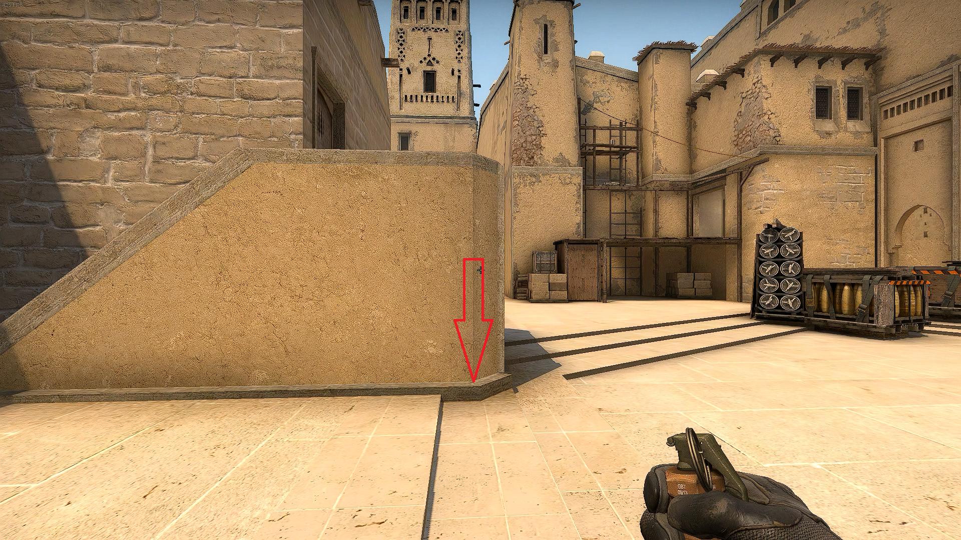 Видите небольшой выступ в стене, который образует угол? Наводим прицел в его верхнюю часть и уводим перекрестие чуть левее. После этого делаем несколько шагов и бросаем флэшку на бегу. Таким образом вы ослепите соперников на всех основных позициях точки В.