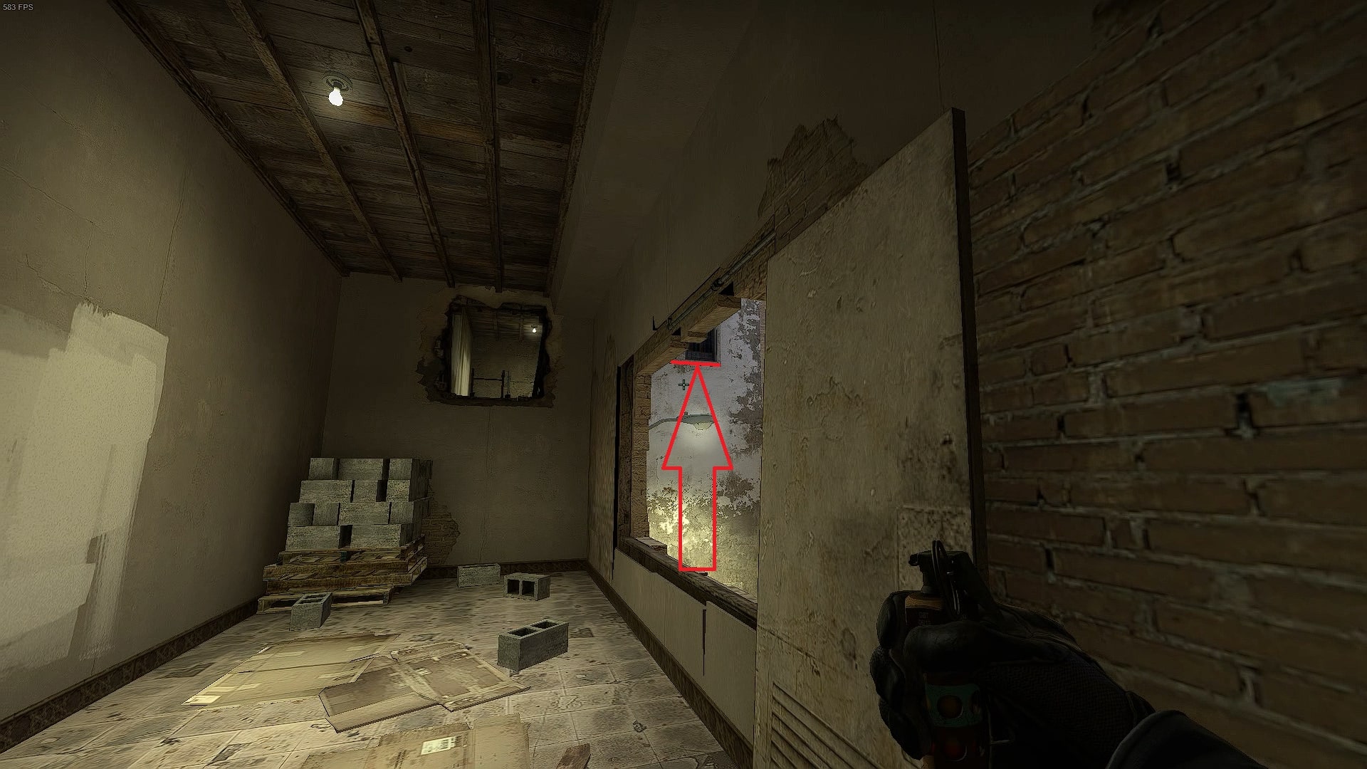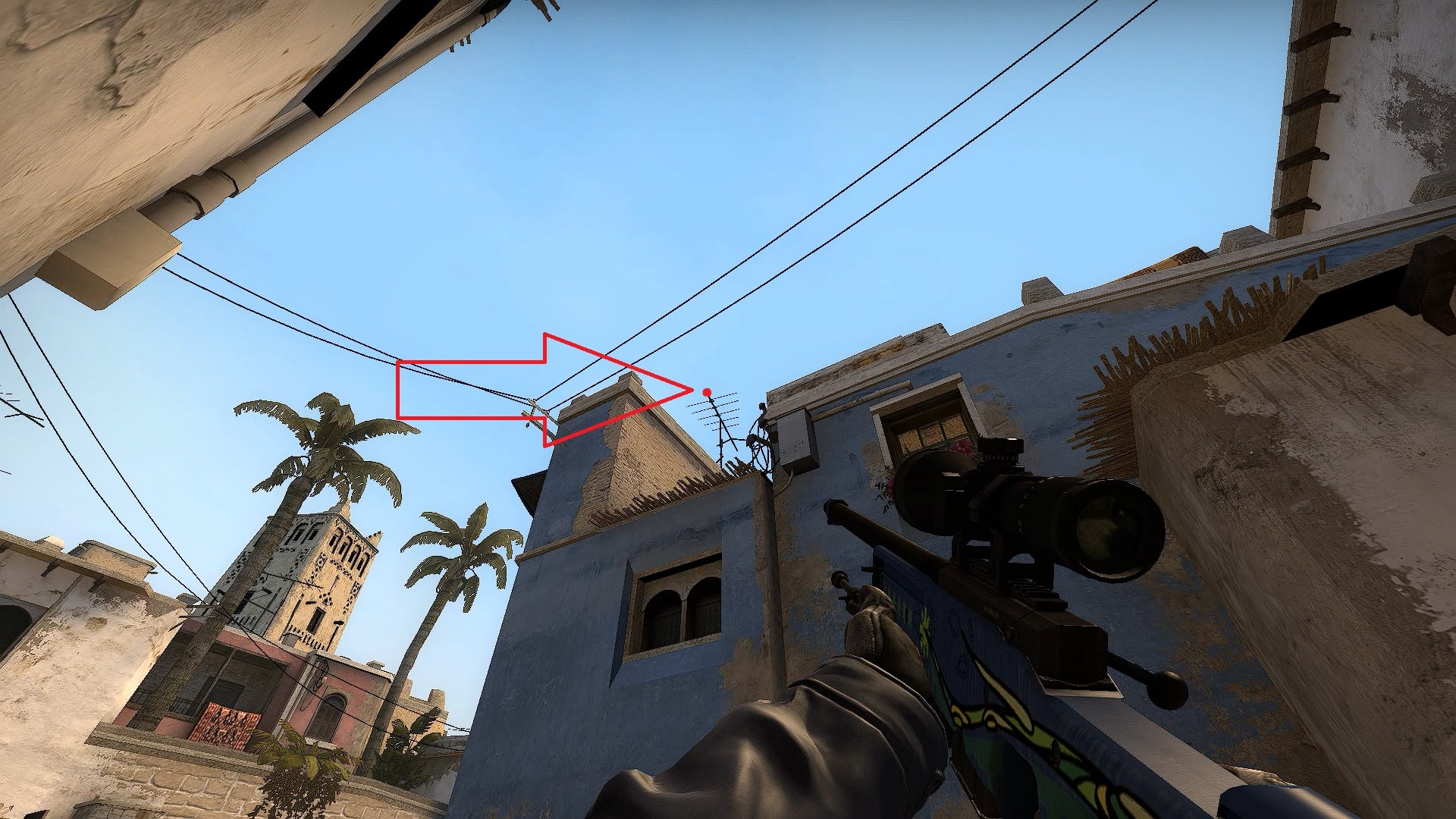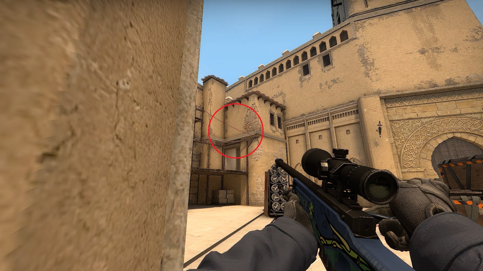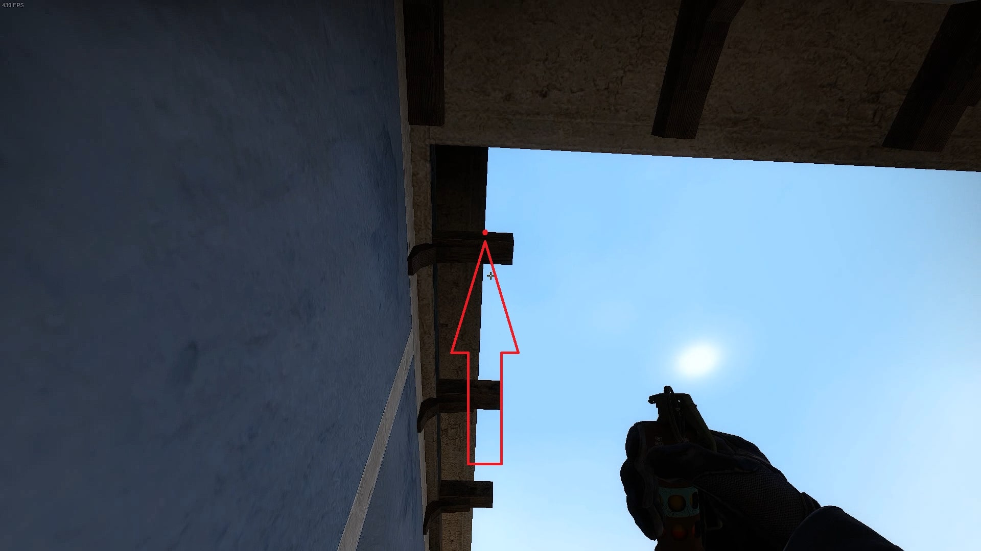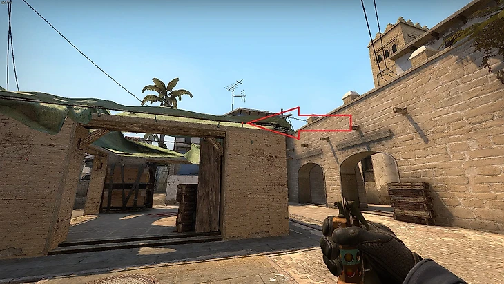 Нам необходимо прицелиться в пересечение между крышей и тонкой серой линией, которая идет по стене. Спустя первые несколько попыток вы отточите эту раскидку до идеала.