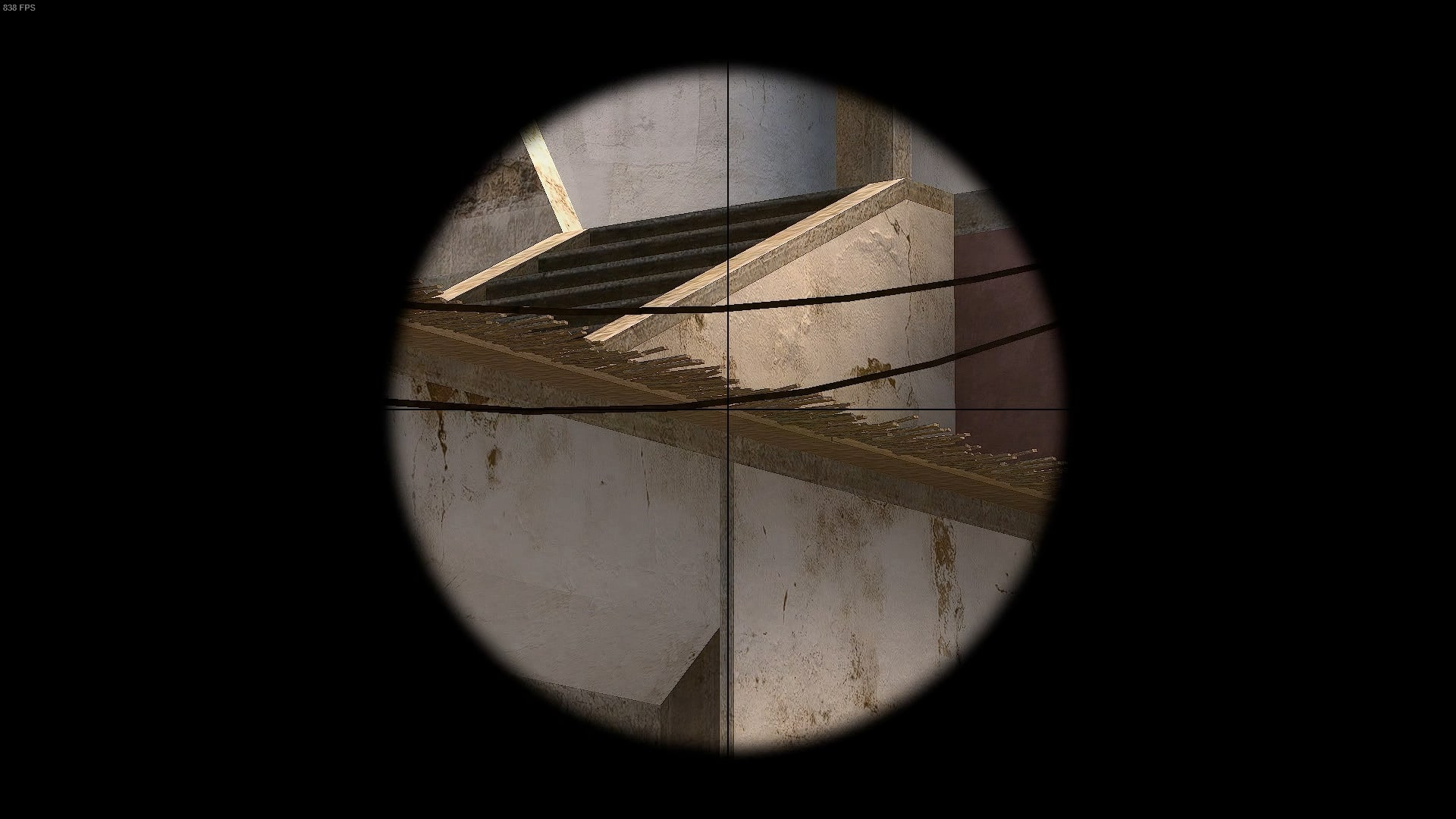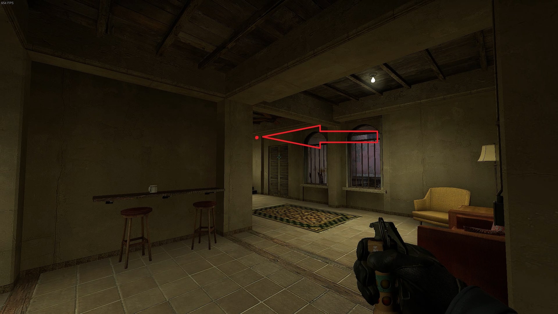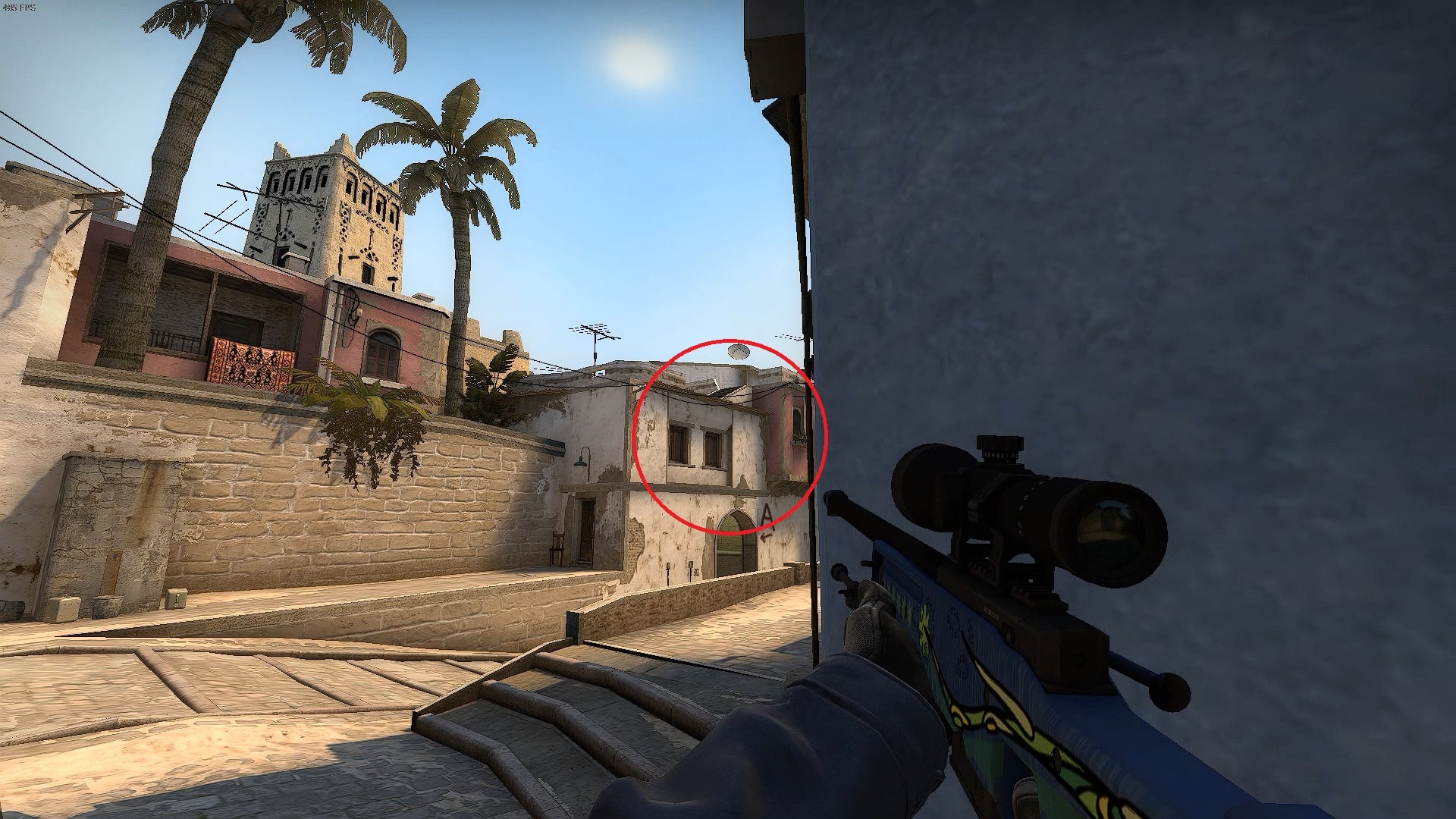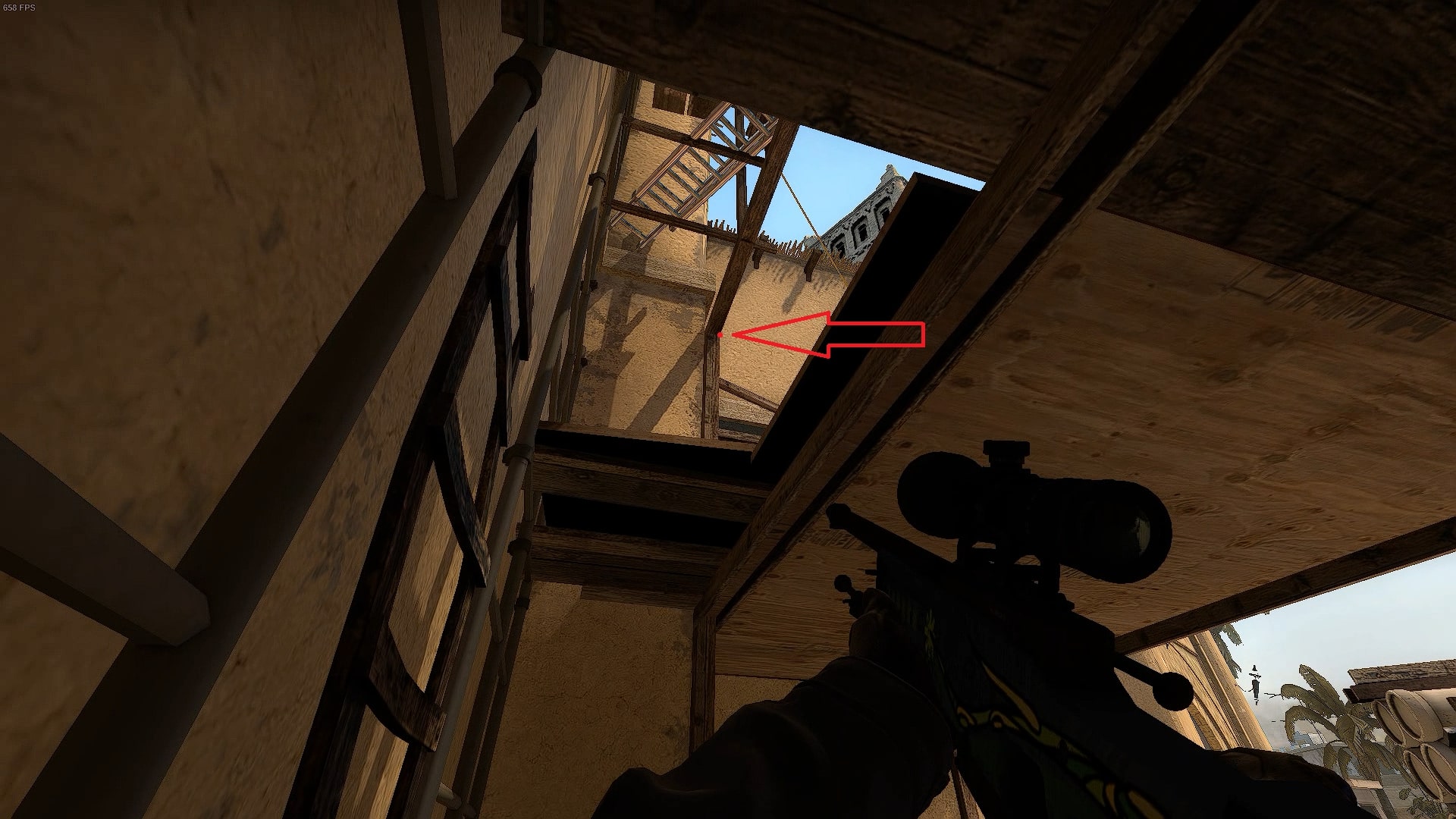 Нам необходимо прицелиться в пересечение между крышей и тонкой серой линией, которая идет по стене. Спустя первые несколько попыток вы отточите эту раскидку до идеала.