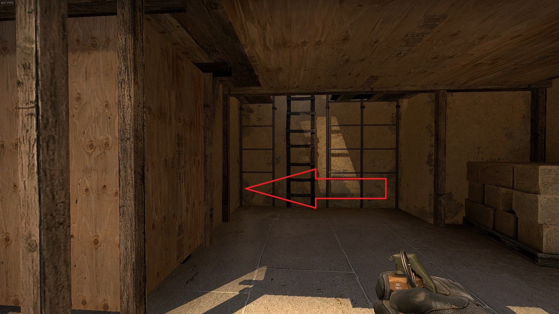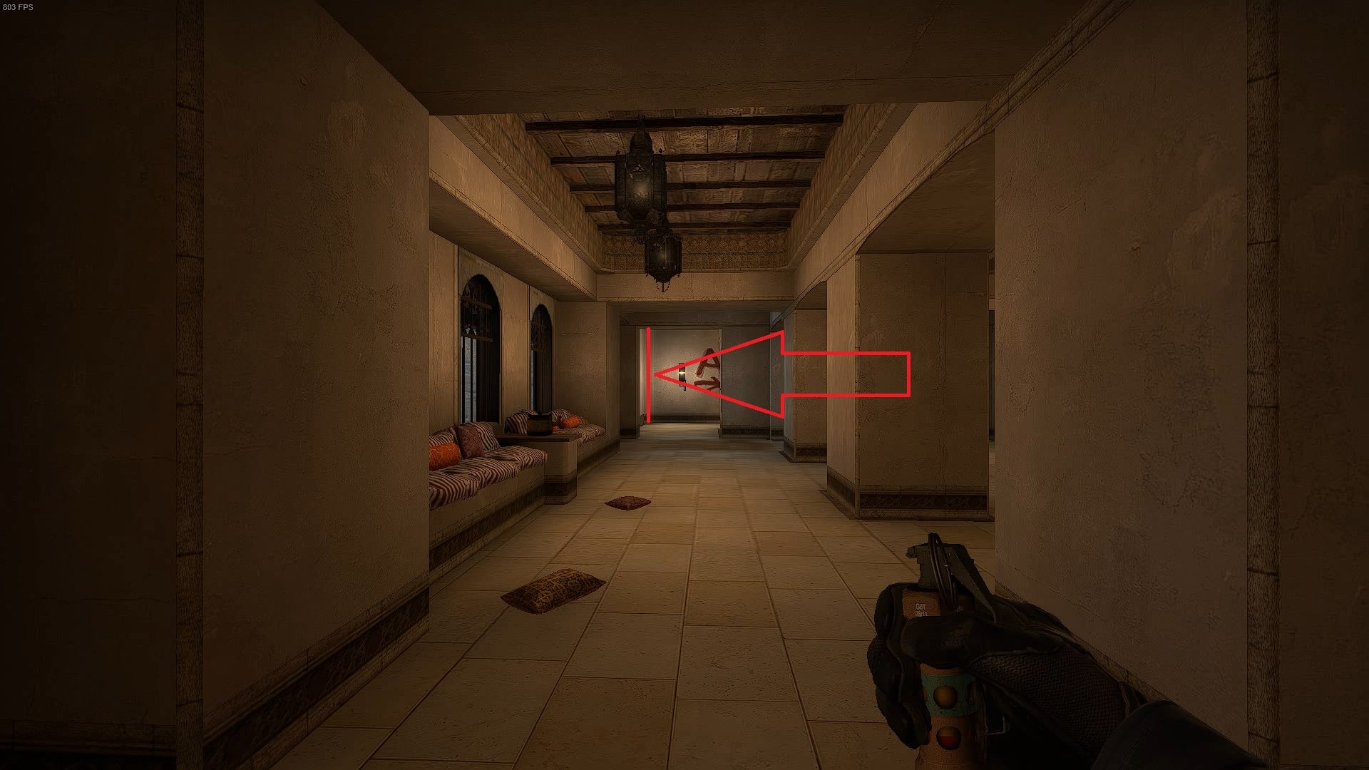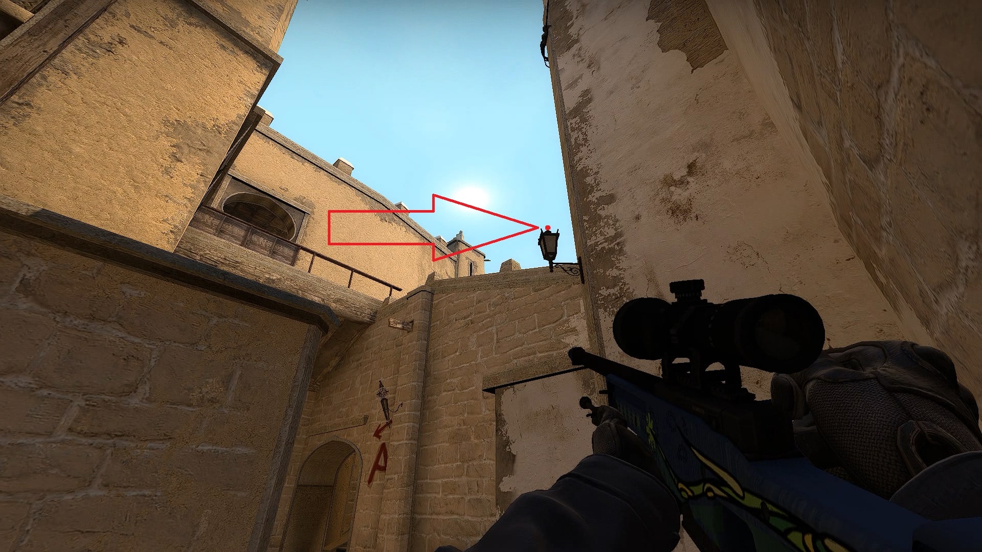 Сверху вы увидите настенный фонарь, в верхнюю часть которого нам и нужно прицелиться. Просто кидаем гранату с места – она ослепит соперников почти во всех позициях на точке А.
