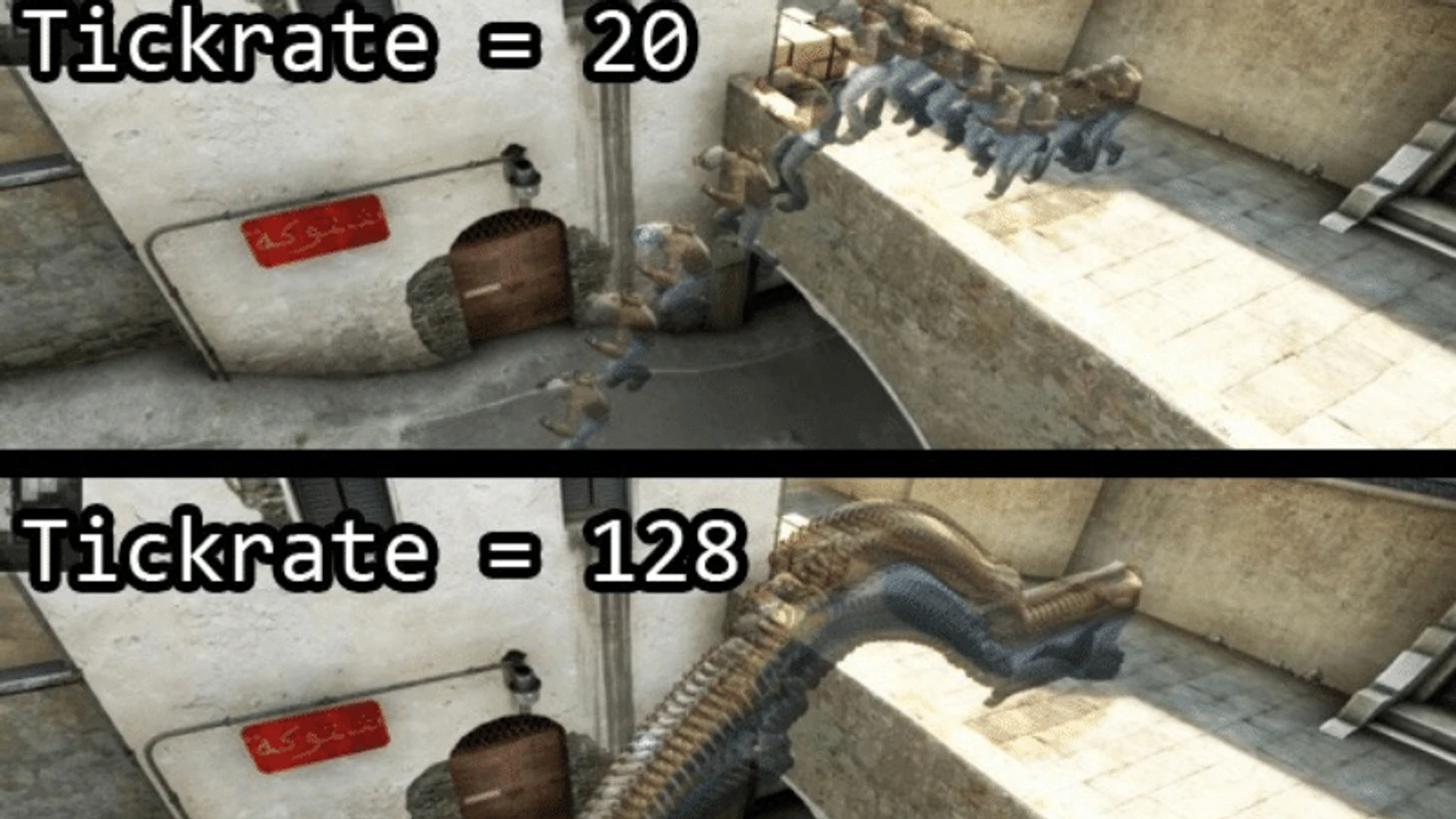 Проще говоря, чем больше тиков в секунду обрабатывает сервер, тем качественнее игра будет обрабатывать ваши выстрелы. Вот наглядная демонстрация разницы между маленьким и большим тикрейтом.
