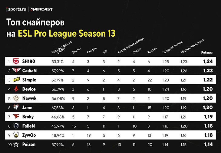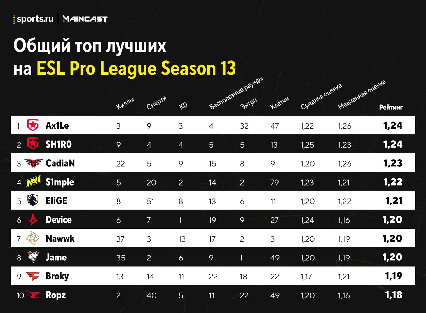 Рейтинг ESL Pro League после группового этапа: Ax1le – лучший игрок, Sh1r0 – лучший снайпер, S1mple – 4-й