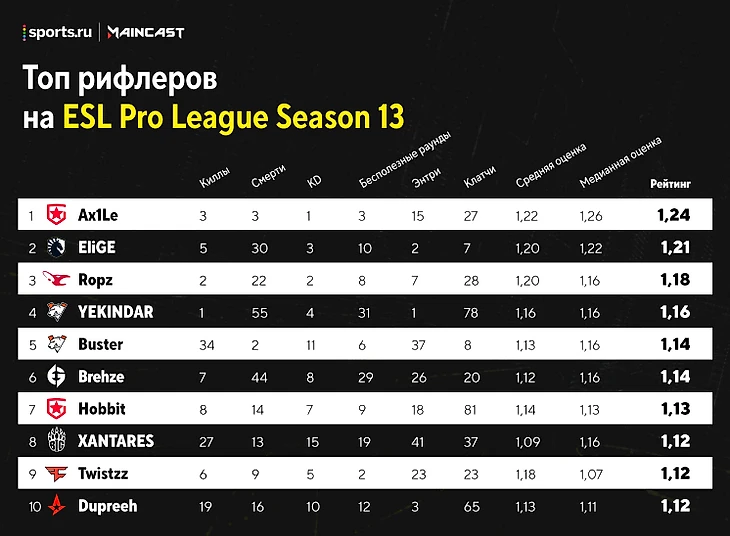 К 13 сезону ESL Pro League концепция рейтинга кардинально изменилась. Теперь по итогам каждой карты мы берем показатели игрока, подставляем их в формулу и получаем оценку. По итогам турнира берется среднее значение всех оценок, а также их медиана. Среднее из этих двух чисел = рейтинг игрока за чемпионат.