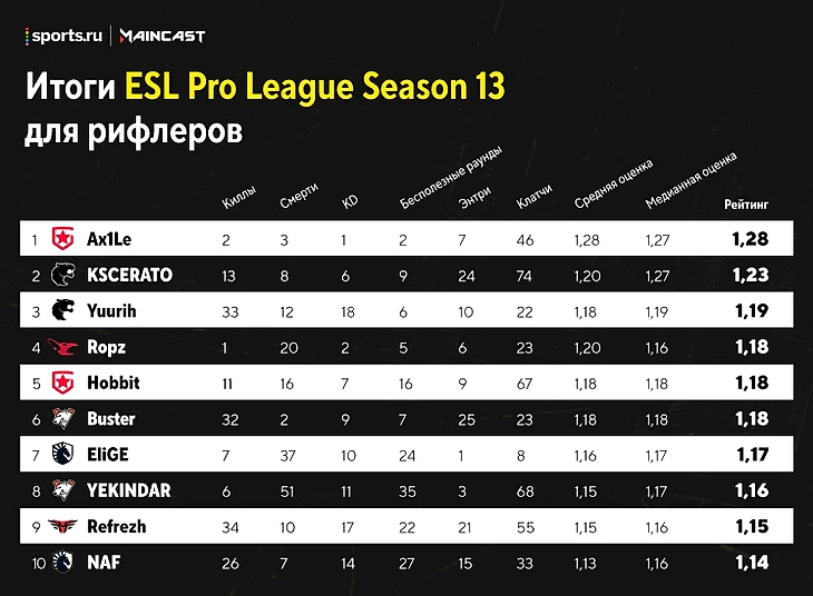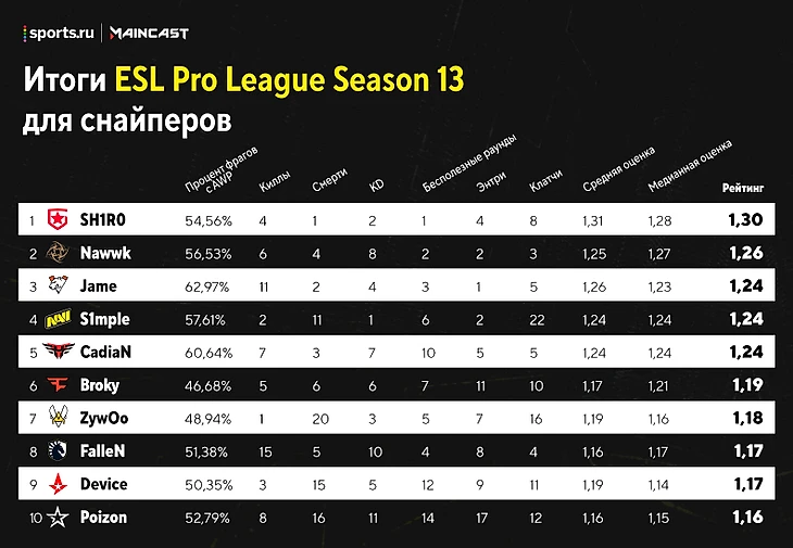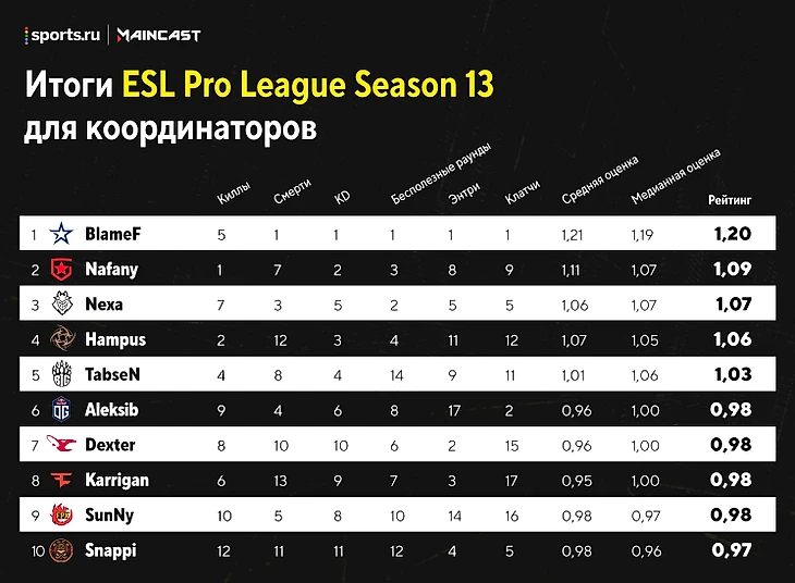 ★ Gambit – сильнейшая команда ESL Pro League Season 13 по индивидуальным показателям. Sh1r0 – с отрывом лучший игрок чемпионата. Ax1le уверенно занял первое место среди рифлеров, а Hobbit вошел в топ-5. Nafany показал достойную статистику для капитана и стал 36-м в общей таблице. Главная проблема – Interz: 25-я строчка в рейтинге рифлеров и 43-я позиция среди всех игроков. Именно Интерза не хватило в гранд-финале для победы над Heroic: у рифлера Gambit худшая средняя оценка по итогам 5 карт – 1,03, а его игра на заключительном Мираже с 4 киллами за 22 раунда – худший перформанс гранд-финала с оценкой 0,73.