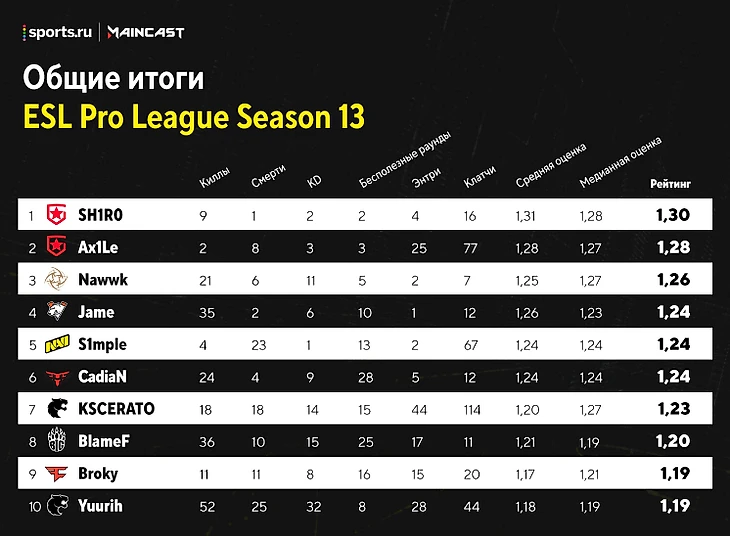 Рейтинг игроков по итогам ESL Pro League: Sh1r0 и Ax1le – вне конкуренции, Бумыч – в двадцатке худших