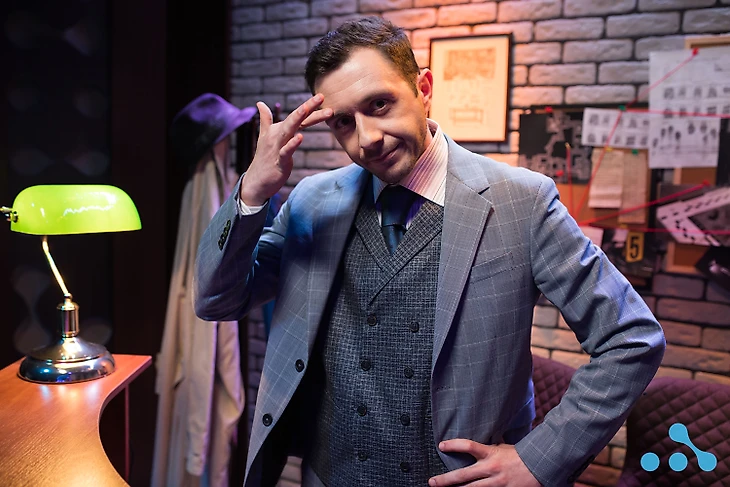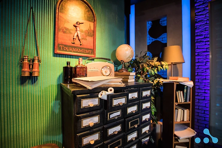 Студия аналитики и комментаторская оформлены в стиле кабинета полиции. Все атрибуты на месте: деревянный стол с телефоном, печатная машинка, картотека.