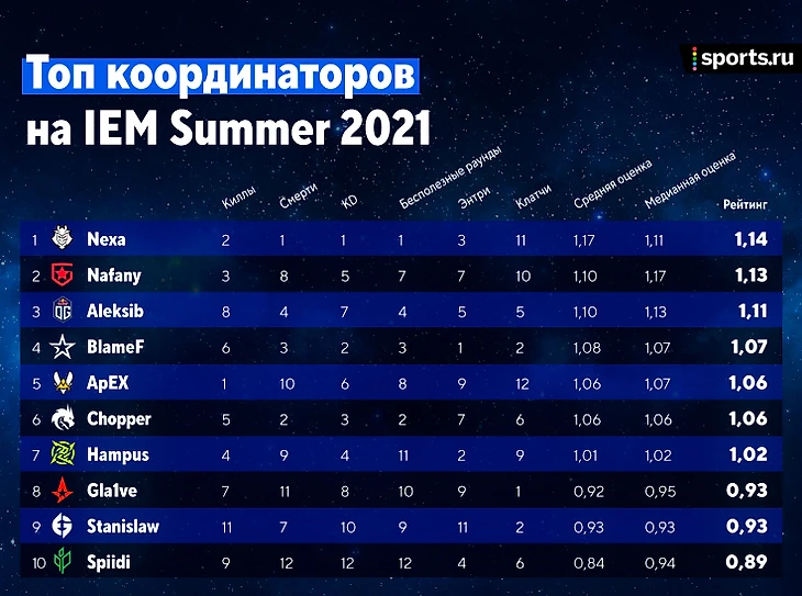 ★ IEM Summer 2021 – лучший турнир Vitality за долгое время. Причем выход в полуфинал и победа над Gambit в группе – заслуга не только ZywOo. Звездный снайпер, конечно, блеснул рейтингом 1,37 и стал лидером команды, но Misutaaa с 1,31 и Kyojin с 1,25 отстали не так уж сильно. На фоне партнеров не так круто смотрится Shox с 1,12 – №14 среди рифлеров и №21 среди всех. Есть вопросы и к Апексу, еле опередившему Чоппера в борьбе за топ-5 капитанов: индекс 1,06 и 35-е место в общей таблице – это неплохо для IGL, но далеко от идеала в целом. По сумме рейтингов Vitality показала крутой результат – 6,11, но сможет ли она удержать планку на ближайшем Бласте и особенно в Кельне?