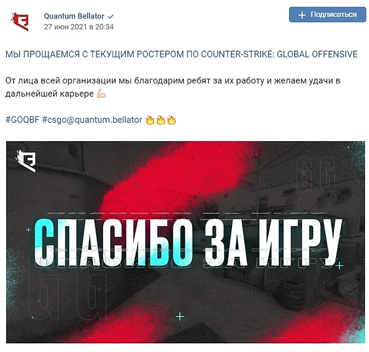 Российская киберспортивная организация Quantum Bellator Fire официально распустила свой состав по CS:GO. Об этом она сообщила в своих соцсетях.