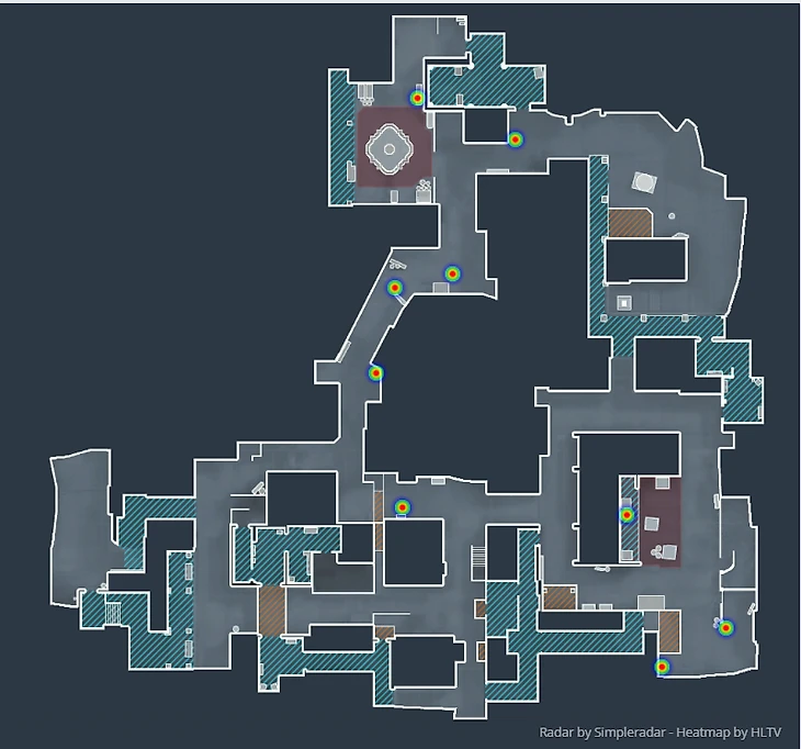 Для примера посмотрим последнюю игру VP на Inferno. Тогда на StarLadder CIS RMR они проиграли эту карту K23. На картинке ниже показаны энтри VP при игре в защите. Как видно, агрессивная игра на банане и миде дала всего-лишь 3 фрага (энтри на цементе не в счет).