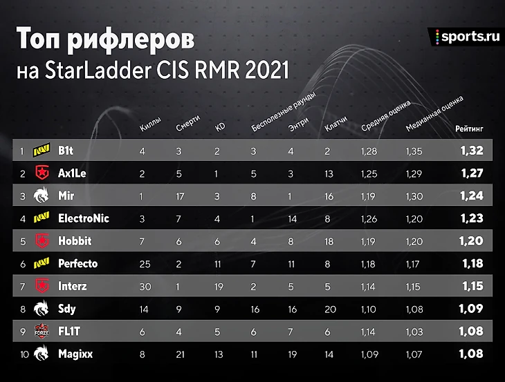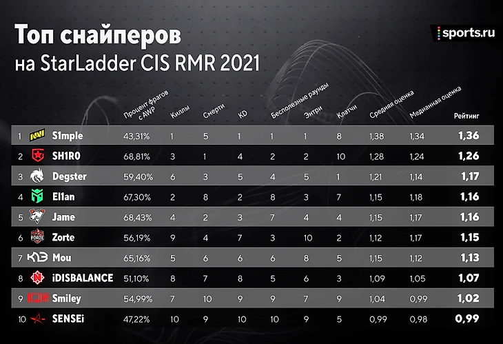 ★ Virtus.pro – главное разочарование турнира. Проблемы VP, начавшиеся еще на IEM Katowice 2021, вышли на новый уровень – теперь в составе хорошо играет только Jame. Уже 6-й чемпионат подряд капитан Virtus.pro тащит команду к победе, но если на IEM Summer ему помогал Qikert, а на EPIC CIS League – Buster, то сейчас вся четверка рифлеров провалилась. Yekindar и Buster отыграли на рейтинг 0,99, а Qikert и Sanji – на 0,98. 35-е, 33-е, 37-е и 38-е места соответственно среди 50 игроков – это абсолютно неприемлемый уровень для гранда региона. В таких условиях 11-я строчка Джейма в общем топе выглядит подвигом. VP не просто плохо сыграла на StarLadder CIS RMR 2021, команда показала, что проблемы, которые подробно описаны в рейтинге весеннего Дримхака, только усугубляются.