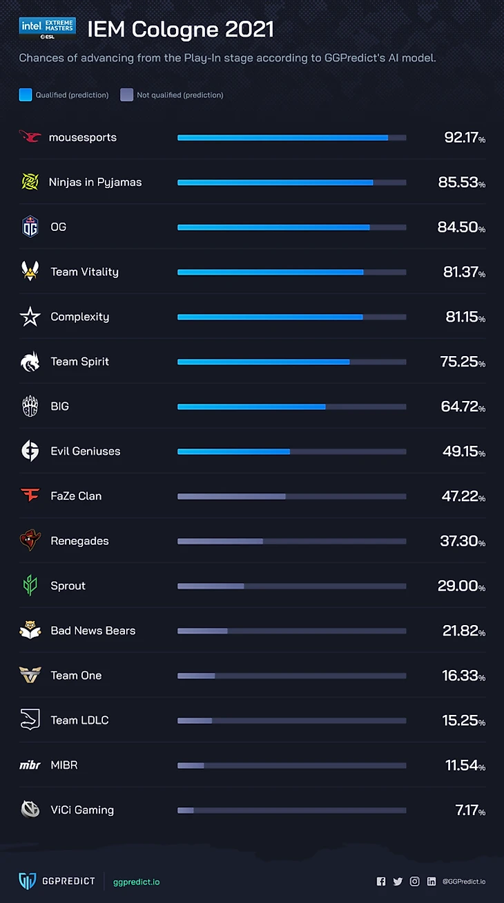 Началась Play-in стадия IEM Cologne – первого лана, спустя 500 дней онлайн-эры. Из 16 команд в основную стадию выйдет лишь 8. Для прохода достаточно выиграть всего 2 матча, один раз можно ошибиться. Искусственный интеллект GGPredict предсказал вероятность прохода команд в следующую стадию.