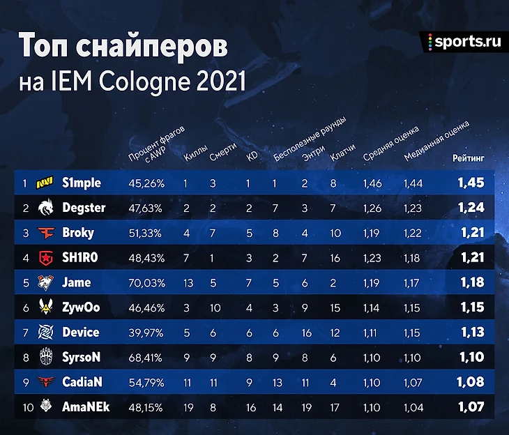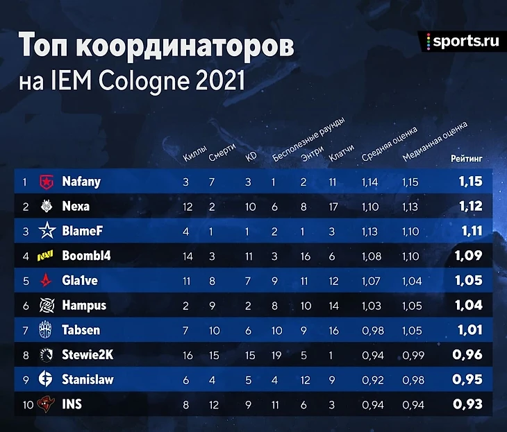 Это не самые плохие показатели, но для Аксиля такой уровень недостаточно хорош. В остальном достоин аплодисментов Nafany – лучший капитан IEM Cologne по индивидуальной статистике и №17 в общей таблице. Hobbit и Sh1r0 подвигов не сделали, но все равно заняли достойные места: рифлер Gambit – 12-й среди всех игроков, а снайпер – 8-й. Interz с рейтингом 1,03 – 26-й в списке рифлеров и 42-й в общей таблице.