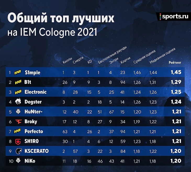 ★ NAVI – с огромным отрывом лучшая команда по итогам IEM Cologne 2021. В играх на вылет прибавил весь состав (сумма рейтингов по сравнению с группой выросла с 5,72 до 6,29), и NAVI без шансов расправились с оппонентами. Топы говорят сами за себя – каждый игрок команды Блейда провел феноменальный турнир. Для Электроника IEM Cologne – лучший чемпионат за 2021-й год, для Бита и Симпла – второй по рейтингу. По индивидуальным показателям не блеснул только Boombl4 – 27-е место в общем списке, но к капитану чемпионов вопросов быть не может.