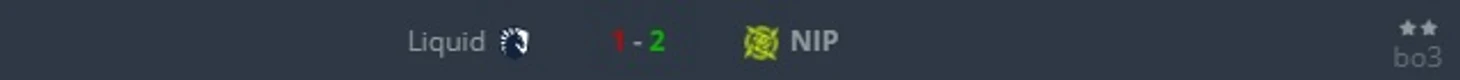 Американцы из Liquid и шведы из NIP сыграли упорный матч, где упорной была только первая карта. Overpass, пик Ниндзей дошел до овертайма, где Жидкие одержали верх 19-17. Однако, дальше Ликвиды как будто ушли с сервера: Dust2 (пик американцев) завершился со счетом 16-6, а решающий Mirage и вовсе 16-2. Шведы идут дальше по верхней сетке, американцы отправляются в нижнюю.
