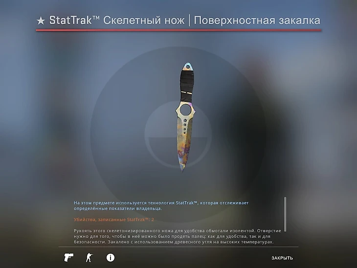 Следующий по возрастанию стоимости нож – СтатТрек Скелетный нож Поверхностная закалка за 62 тысячи рублей. Качество скина – «после полевых испытаний».