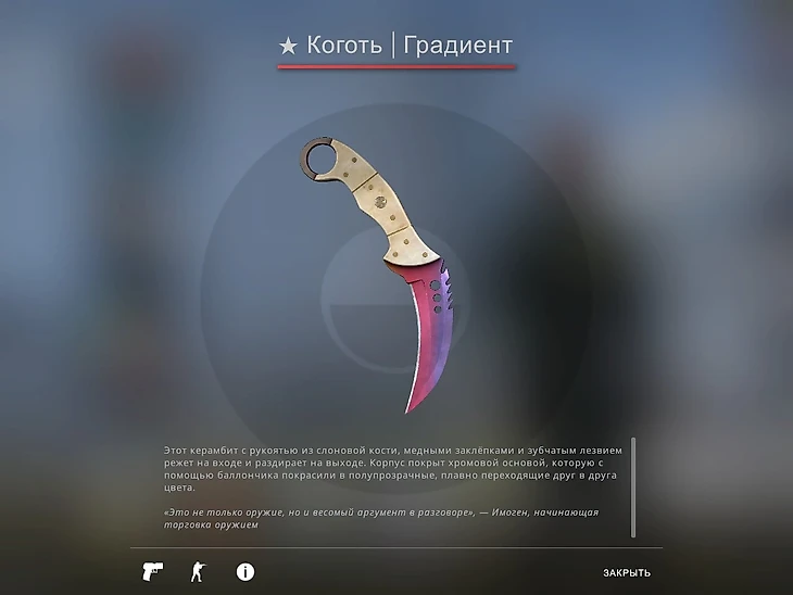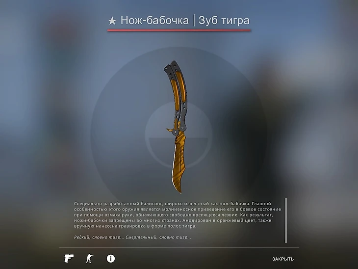 Напоследок 2 скина, стоимость которых очень близка к ста тысячам, оба в качестве «прямо с завода»: Коготь Градиент за 91 тысячу и Зуб Тигра за 97 тысяч рублей. Ножи названы в честь покемонов Арканина и Этернатуса.