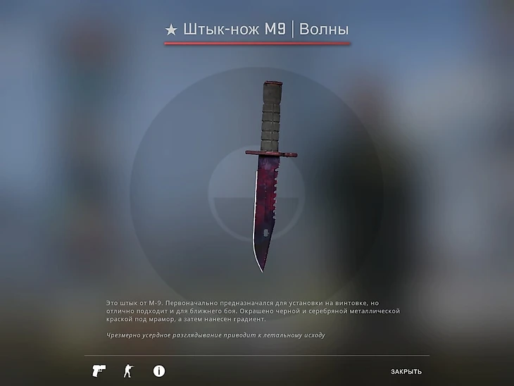 Самый дешевый из ножей Ильи – M9 Волны в паттерне Фаза 2 и качестве «прямо с завода» за 55 тысяч рублей. На нем есть именной тег «手羽先», что переводится как «куриные крылышки». Как говорил Илья – это его любимый нож в игре, с которым он играет уже очень давно.