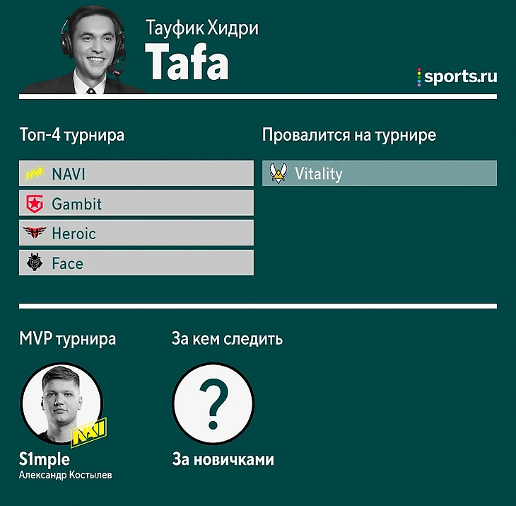 Как будет выглядеть топ-4? Не буду оригинальным. На 100% уверен, что свои места должны забрать NAVI, Gambit и G2. Четвертым полуфиналистом, скорее всего, станет Heroic, но я очень хотел бы увидеть на этом месте Faze.