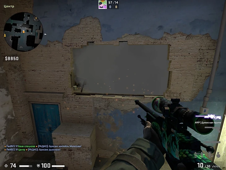 Одно из самых популярных мест, где такой трюк может сработать – окно на Мираже. «Молотов», откинутый как на скрине не будет наносить вам урон, в зуме вы будете видеть противников, а они вас нет.