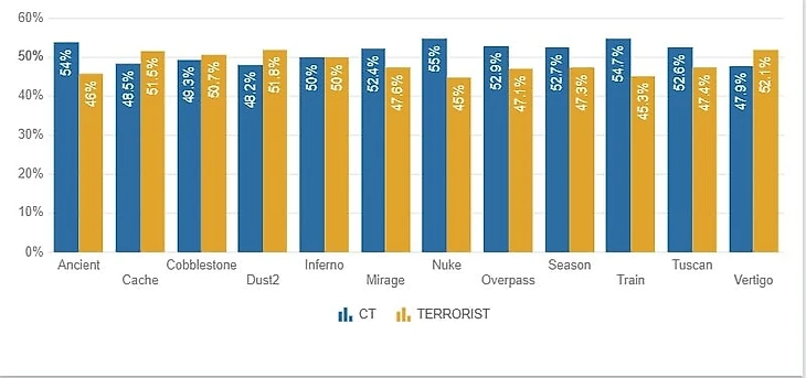 По статистике с про-сцены, на Дасте есть перевес в 3% в пользу атаки (48,2% против 51,8%). Дело в том, что баланс в игре – это не 50 на 50, а незначительное преимущество в 1-2% в пользу защиты. На данный момент Даст на 6 месте по балансу игры среди карт официального маппула. Цифры хуже только на Вертиго.