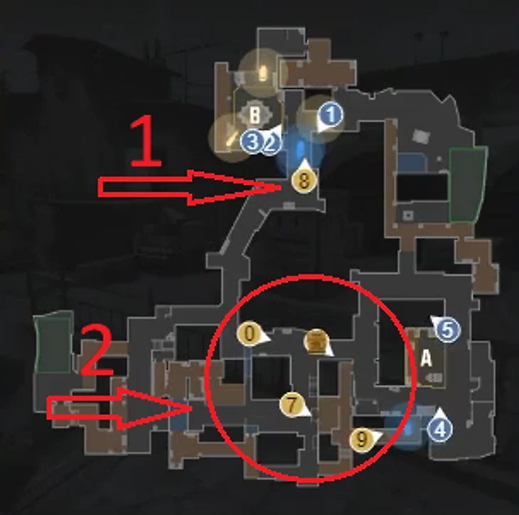 Давайте представим простейшую ситуацию: игроки защиты стоят по системе 2-1-2 (по два игрока на каждой из точек и один игрок – на середине карты), а атакующие каэсеры планируют выход. Нападающие начинают шуметь под одной из точек, раскидывать гранаты и стреляться с соперниками. Естественно, это привлекает внимание игроков защиты, которые могут легко перетянуть одного из тиммейтов с противоположной точки. Так расстановка 2-1-2 превращается в 1-1-3, а зачастую даже в 1-0-4, что оставляет одну из точек ослабленной. В этот момент игроки атаки могут быстро среагировать и спланировать нападение на отпущенную позицию, тем самым заняв ее гораздо проще, чем ранее.