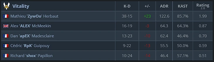 Здесь будет уместно привести в пример лучшего игрока последних двух лет – француза Матье «ZywOo» Эрбо. Он выступает на позиции снайпера в команде Vitality, и в сообществе принято говорить, что Зайву играет каждый матч 1 в 9 (то есть против вражеской команды и четырех тиммейтов). Француз заметно выделяется на фоне товарищей по команде, которые нечасто даже выходят в плюс по убийствам/смертям, в то время как сам ZywOo выдает нереальные цифры.