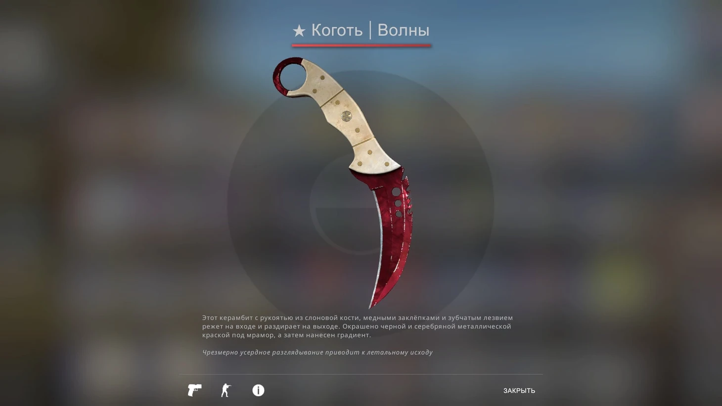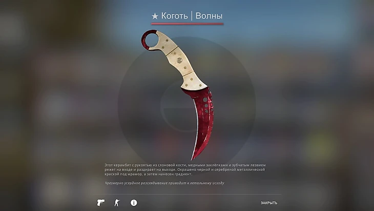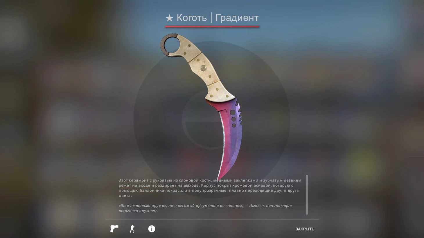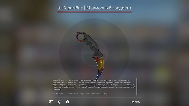 Керамбит Мраморный градиент «прямо с завода» за 80 тысяч рублей. На скине собраны синий, желтый и красный цвет.