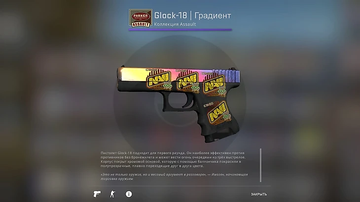 Три Glock-18 Градиент в качестве «закаленное в боях», каждый стоит по 115 тысяч рублей. На одном из них – 4 голографических наклейки NAVI с прошлого RMR-сезона.