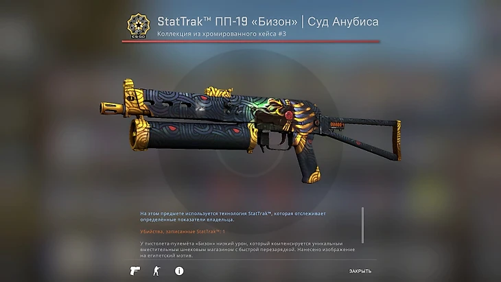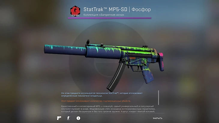 У Алексея есть красивые скины практически на любую пушку, даже на те, с которыми никто не играет: StatTrak Бизон Суд Анубиса (всего 1 фраг) и StatTrak MP5-SD Фосфор, с которым он ни разу не играл. Оба скина в качестве «прямо с завода», стоят 2 и 1,3 тысячи рублей.