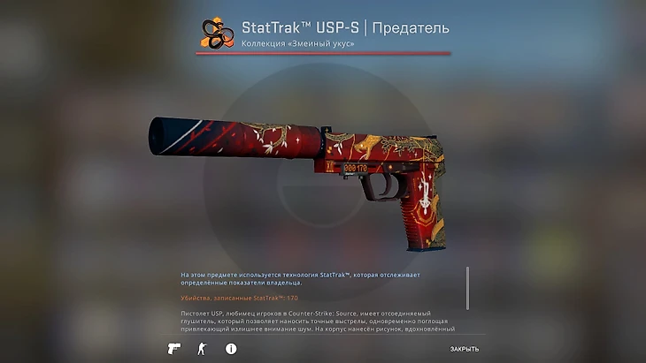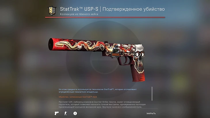 В инвентаре есть 2 USP-S: StatTrak USP-S Подтвержденное убийство за 65 тысяч рублей и Предатель за 25 тысяч. Оба в качестве «прямо с завода», с них сделано относительно немного фрагов: 800 и 120.