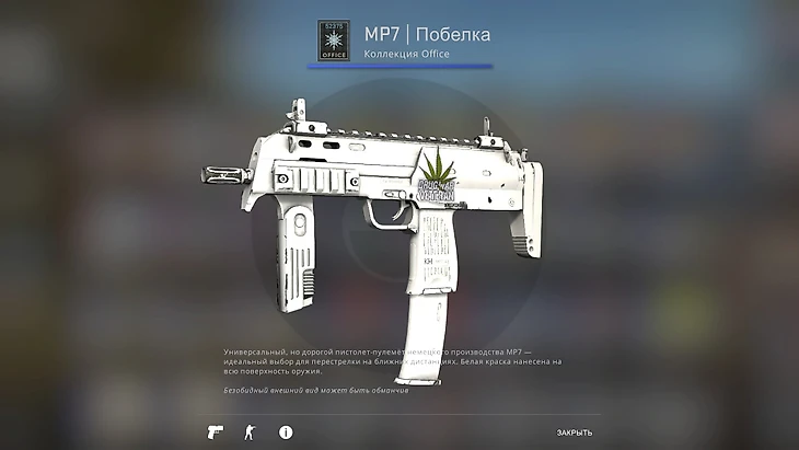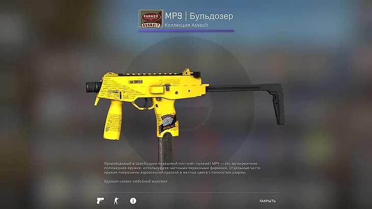 В эту категорию также входят несколько старых и очень редких скинов: MP7 Снежная мгла и MP9 Бульдозер за 25 и 30 тысяч рублей в качестве «прямо завода». Оба скина полностью одноцветные и даже никак не переливаются при осмотре.