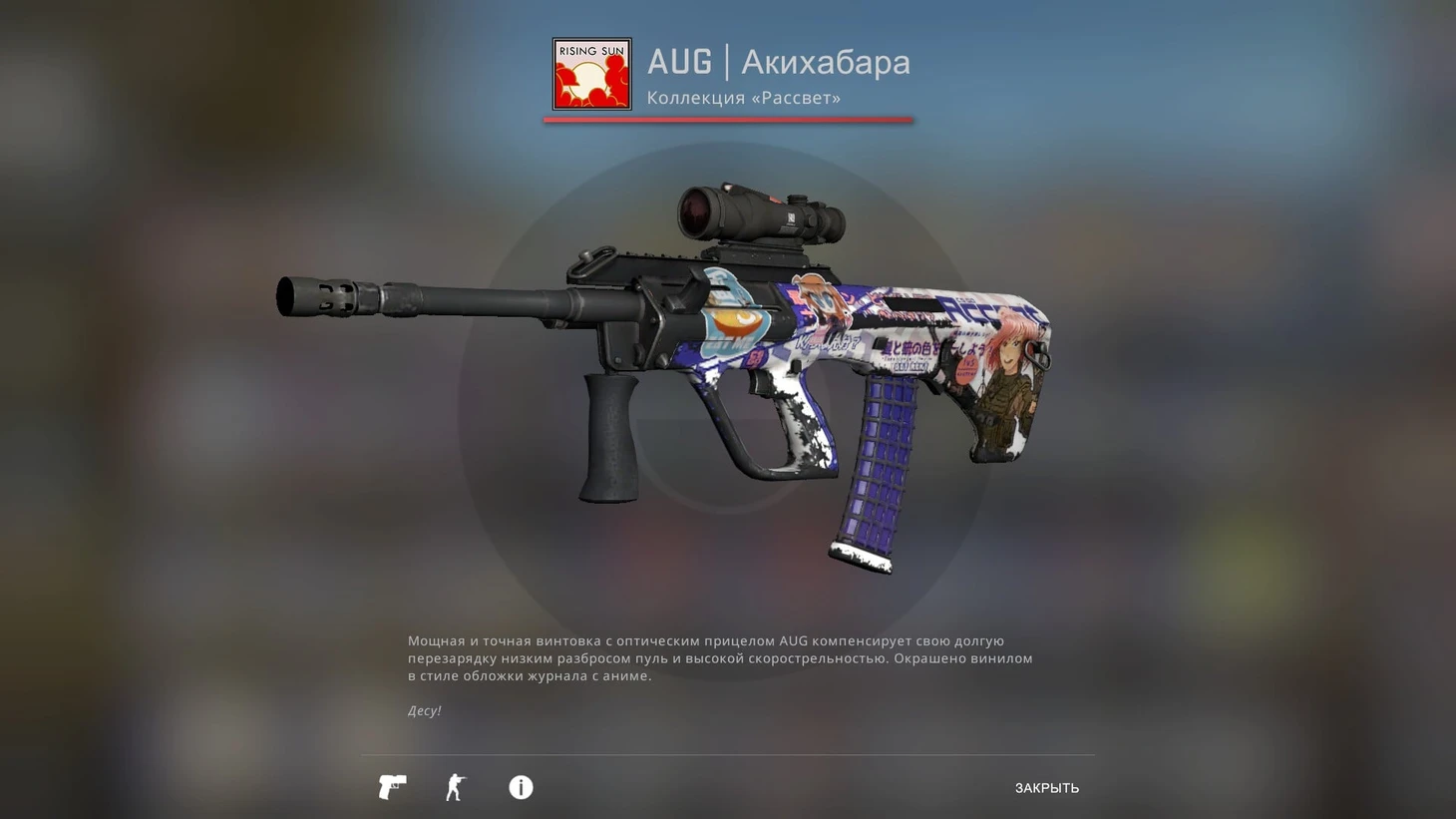 Один из самых красивых скинов в игре – AUG Акихабара за 80 тысяч рублей в качестве «после полевых испытаний». Крутой скин, на котором из-за качества есть много потертостей.