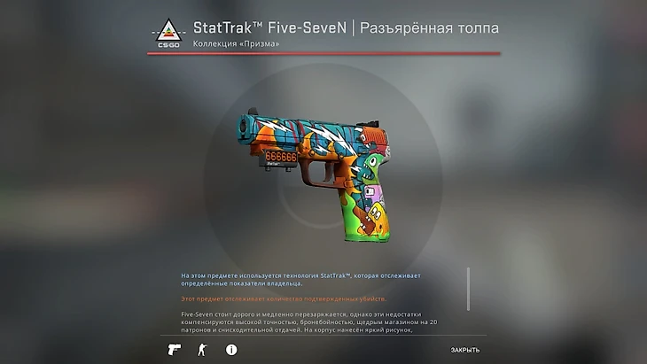 StatTrak Five-Seven Разъяренная толпа стоит 2,6 тысячи рублей за качество «прямо с завода». С ним Ceh9 не играл вообще.