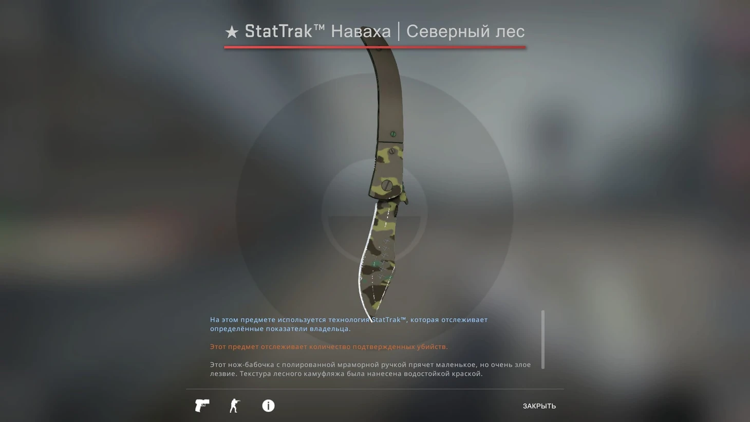 StatTrak Наваха Северный лес за 5 тысяч рублей в качестве «после полевых». Навахи – самые дешевые и скучные ножи в игре, так как у них очень скучные анимации. А раскраска Северный лес считается одной из самых дешевых на него.