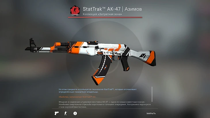 StatTrak AK-47 Азимов в качестве «после полевых» за 4 тысячи рублей. С ним Сеня почти не играл, на счетчике фрагов всего 82 килла.