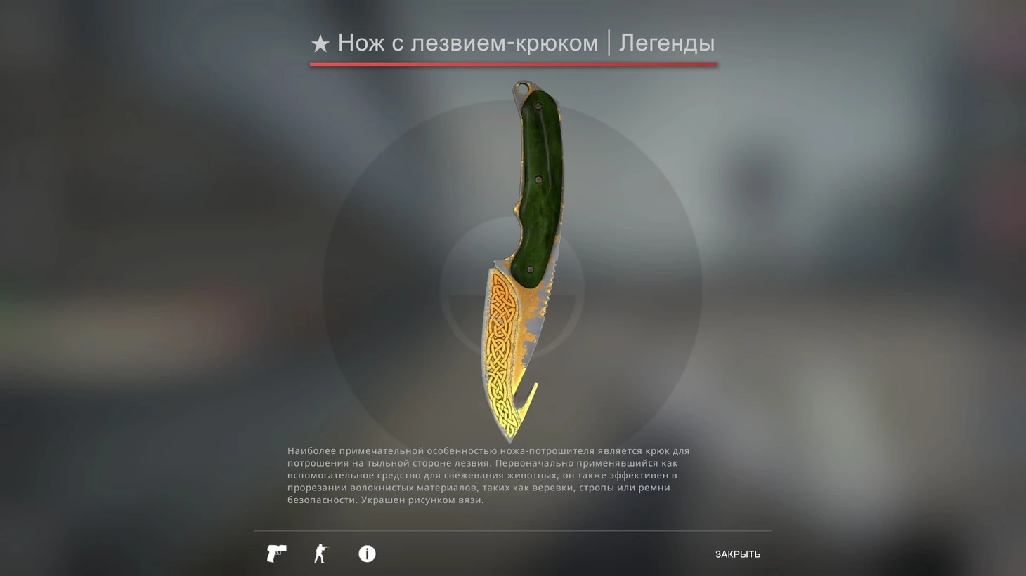 Нож с лезвием-крюком Легенды в качестве «закаленное в боях» за 7,5 тысяч рублей. Красивая раскраска, но из-за плохого качества на ней очень много потертостей, портящих внешний вид.