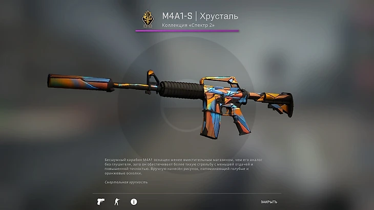 6 M4A1-S Хрусталь по 470 рублей в качестве «немного поношенное». После обновления характеристик эмки скины на нее растут, поэтому их закупка — отличная инвестиция.