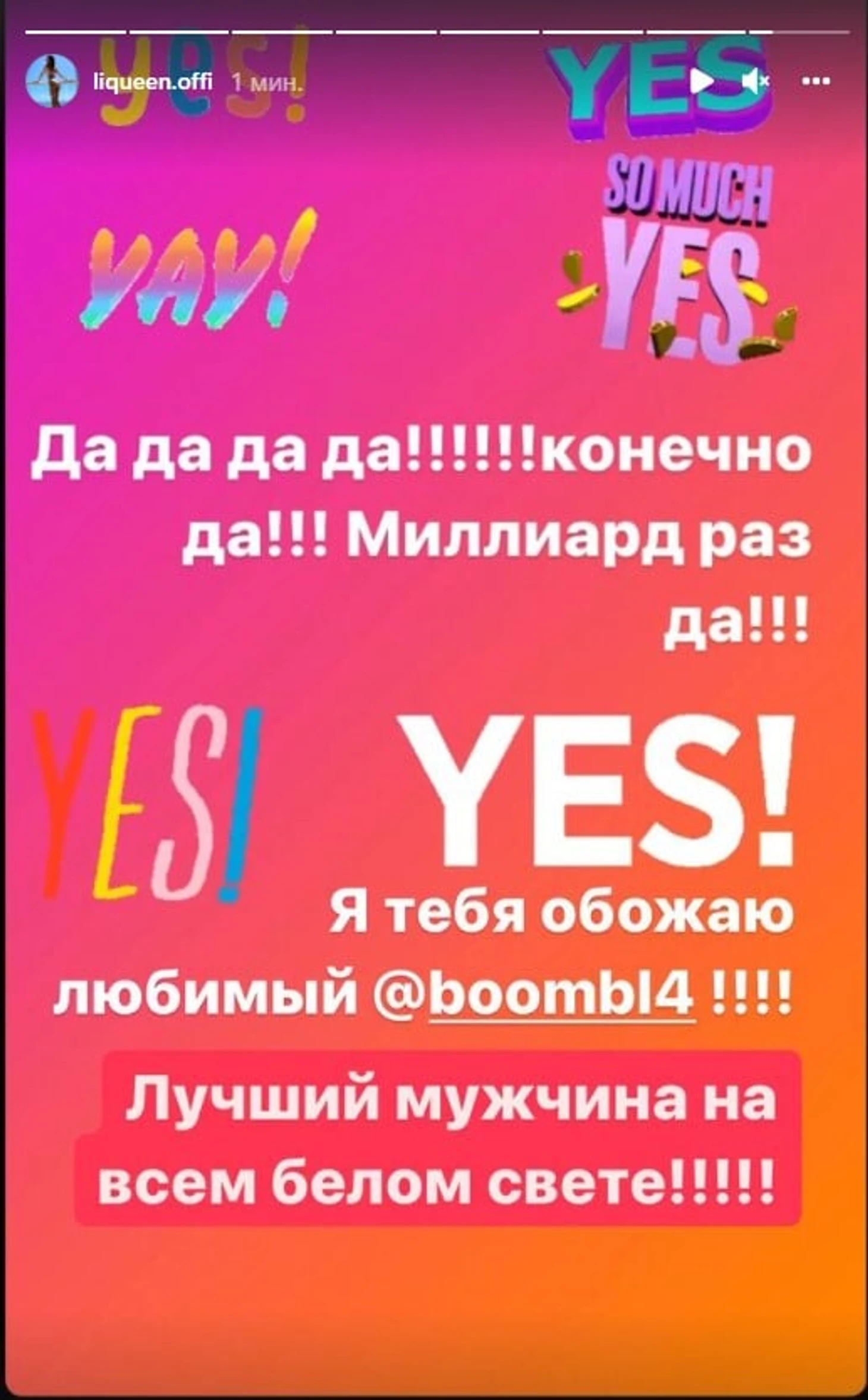 Спустя несколько минут она ответила Бумычу в сторис: «Да, да, да! Конечно, да! Миллиард раз да! Я тебя обожаю, Бумыч! Лучший мужчина на белом свете!».