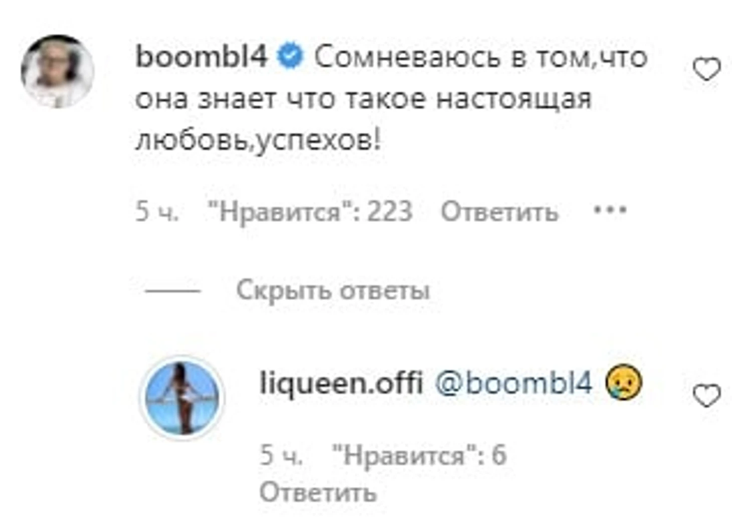 В ответ Лика написала несколько постов с оскорблениями: «[...] Он [...] наркоман. Бумыч не раз предавал меня, делал больно, поэтому мы и разводимся», выложила видео, на котором Кирилл употребляет белый порошок неизвестного происхождения.