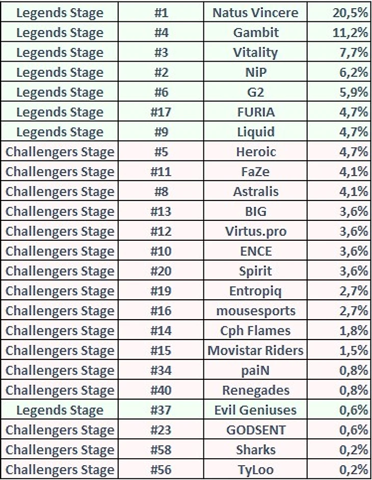 Достаточно высоко оценивается FURIA. Их шансы на победу оцениваются наравне с Liquid и Heroic, а также выше ряда крепких команд, хотя бразильцы давно не показывали свою лучшую игру и долго не могли решить проблему с пятым игроком. 17-е место в рейтинге HLTV – отражение последних результатов команды на мировой арене. Вероятно, в оценке они так высоко из-за Legends Stage – стадии, с которой бразильский состав начнет мейджор.